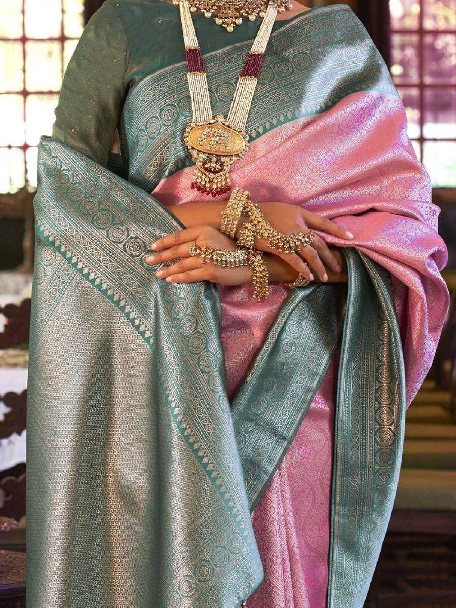 Aesthetically beautiful and contemporarily stylish, the Mesmerizing Pink Heavy Woven Kanjivaram Silk Festive Wear Saree is a stunning choice for any special occasion. Crafted with meticulous attention to detail, this designer pink saree is made of high-quality kanjivaram silk material, achieving a luxurious look and feel. The saree showcases a heavy zari weaving pattern that adds a touch of glamour and elegance.