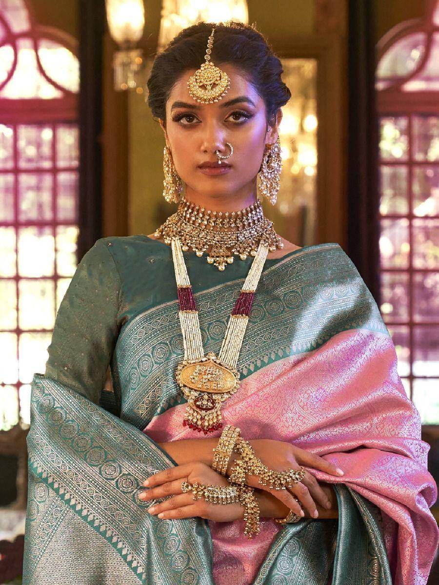 The exquisite pink kanjivaram silk saree is complemented by a green silk blouse, which features intricate zari weaving and stone work. The combination of colors and embellishments creates a truly mesmerizing ensemble, perfect for weddings, receptions, functions, ceremonies, and other grand events.