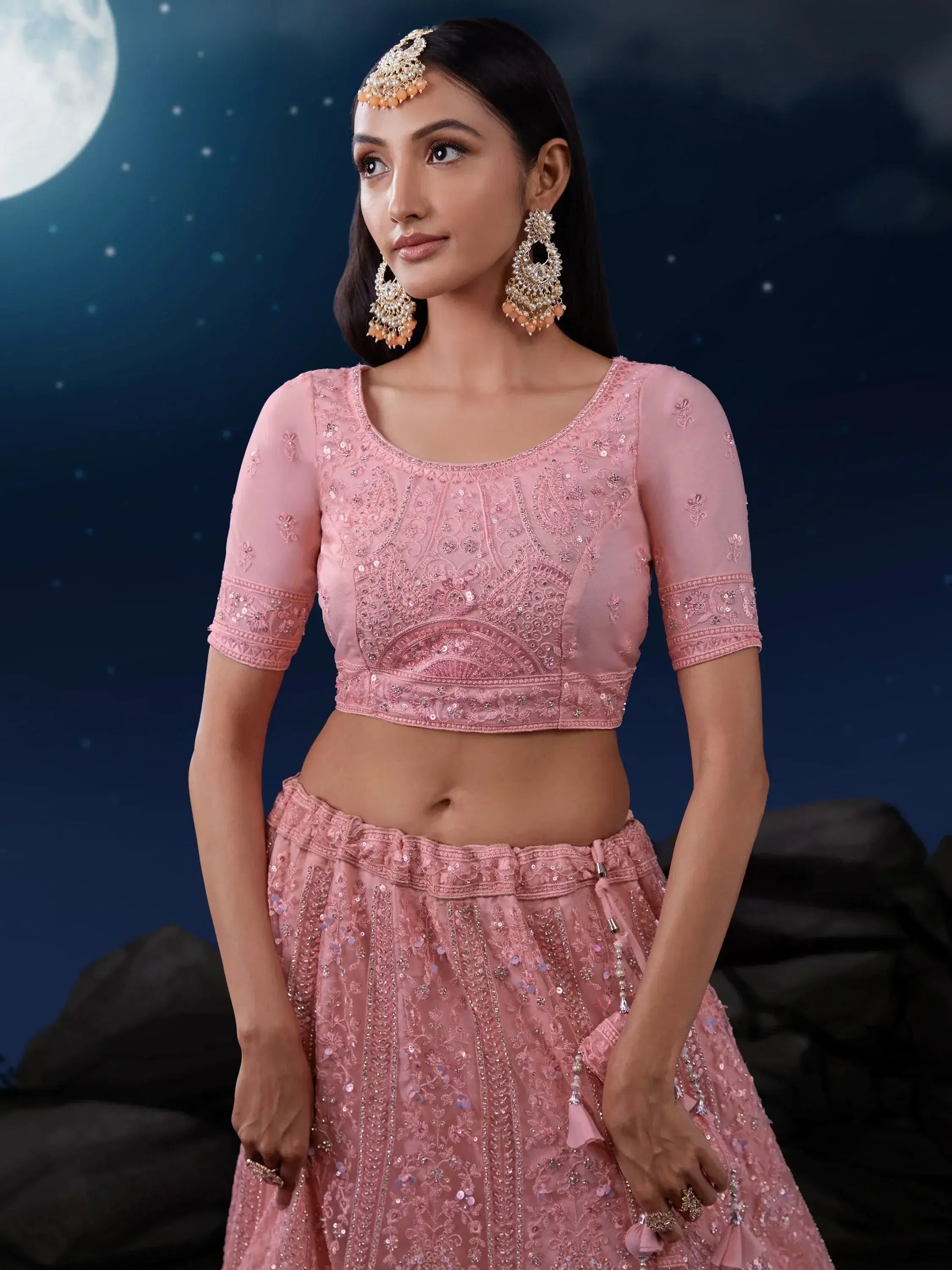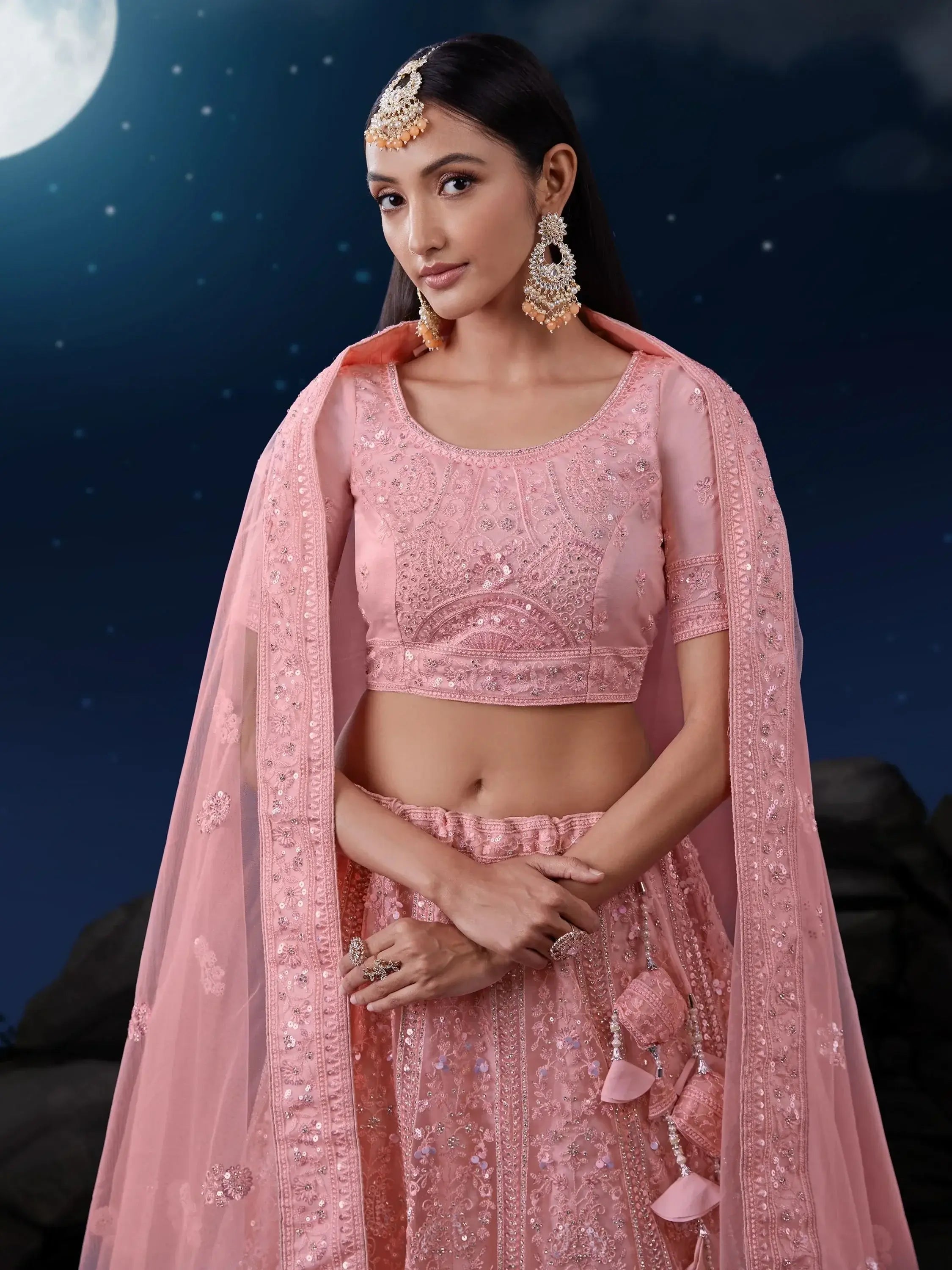 This outfit includes a pink color net material lehenga with dori work, sequin work, and zarkan work, a similar color net material choli with similar work, and a matching net dupatta with dori work, zarkan work, and beautiful sequin lace work. The lehenga is semi-stitched up to 42 inches, allowing for easy customization, and the choli material is unstitched, giving you the freedom to tailor it to your perfect fit.