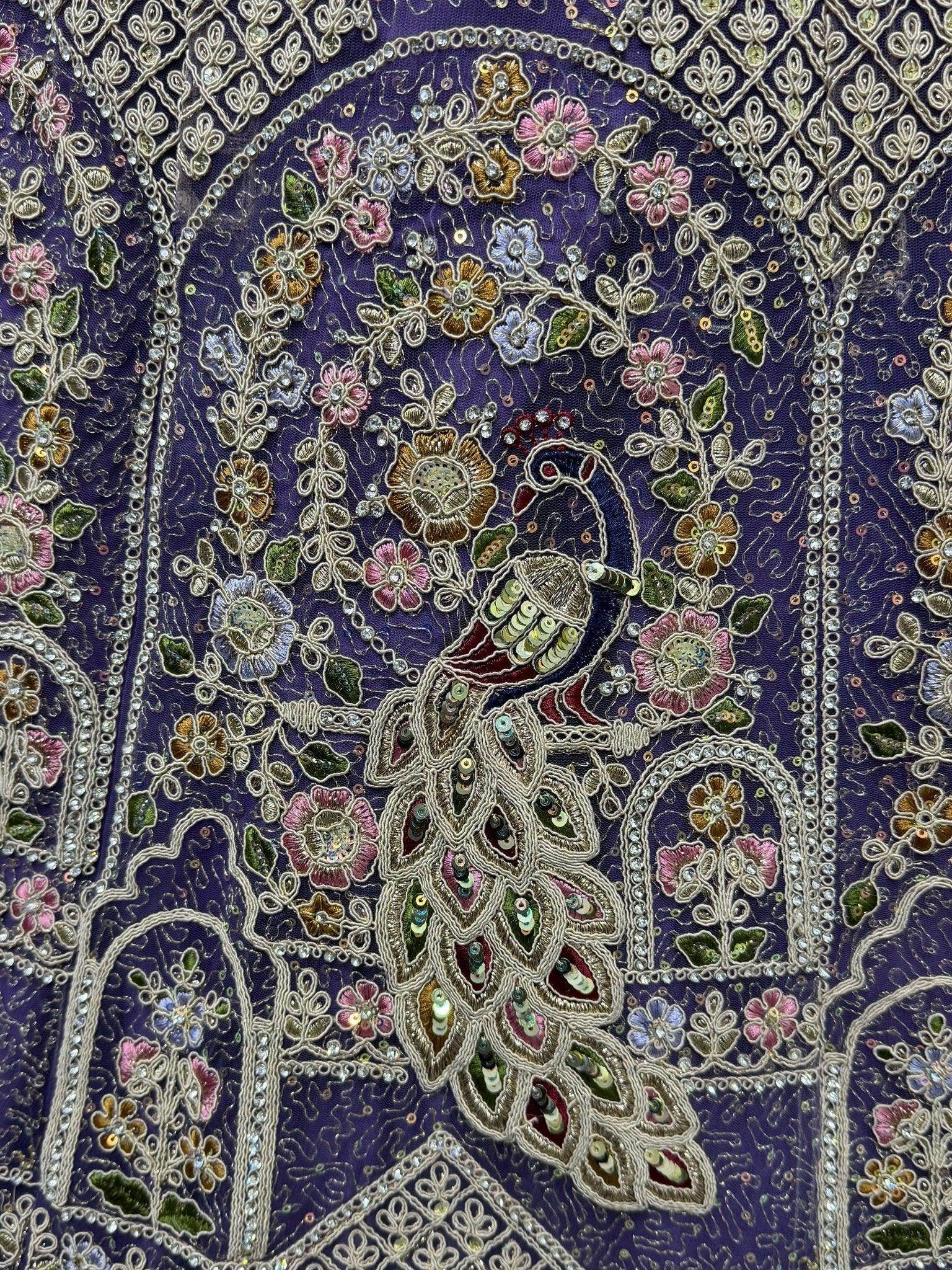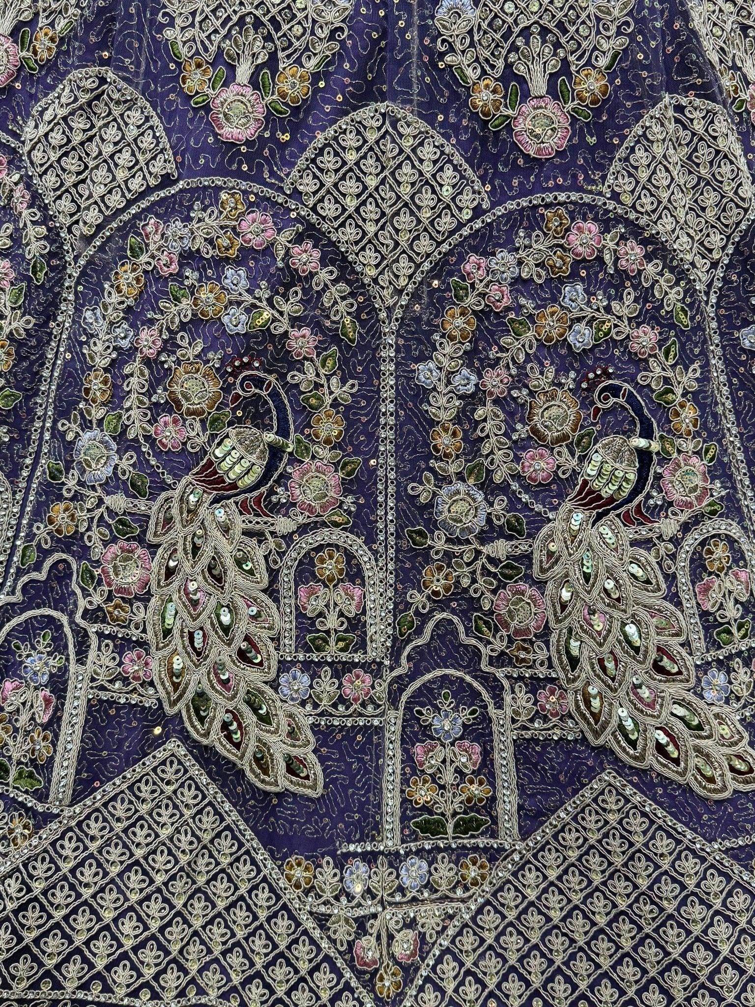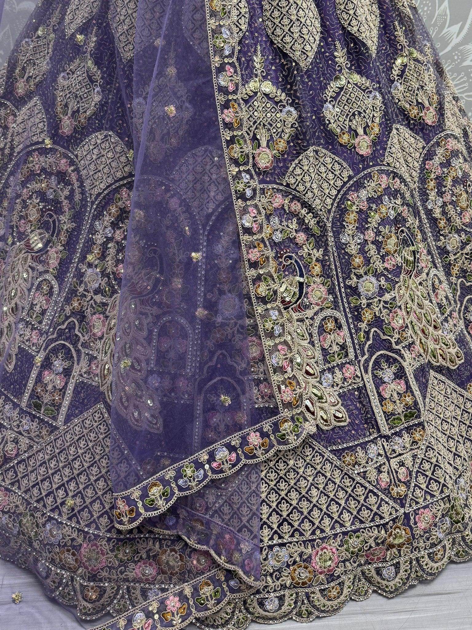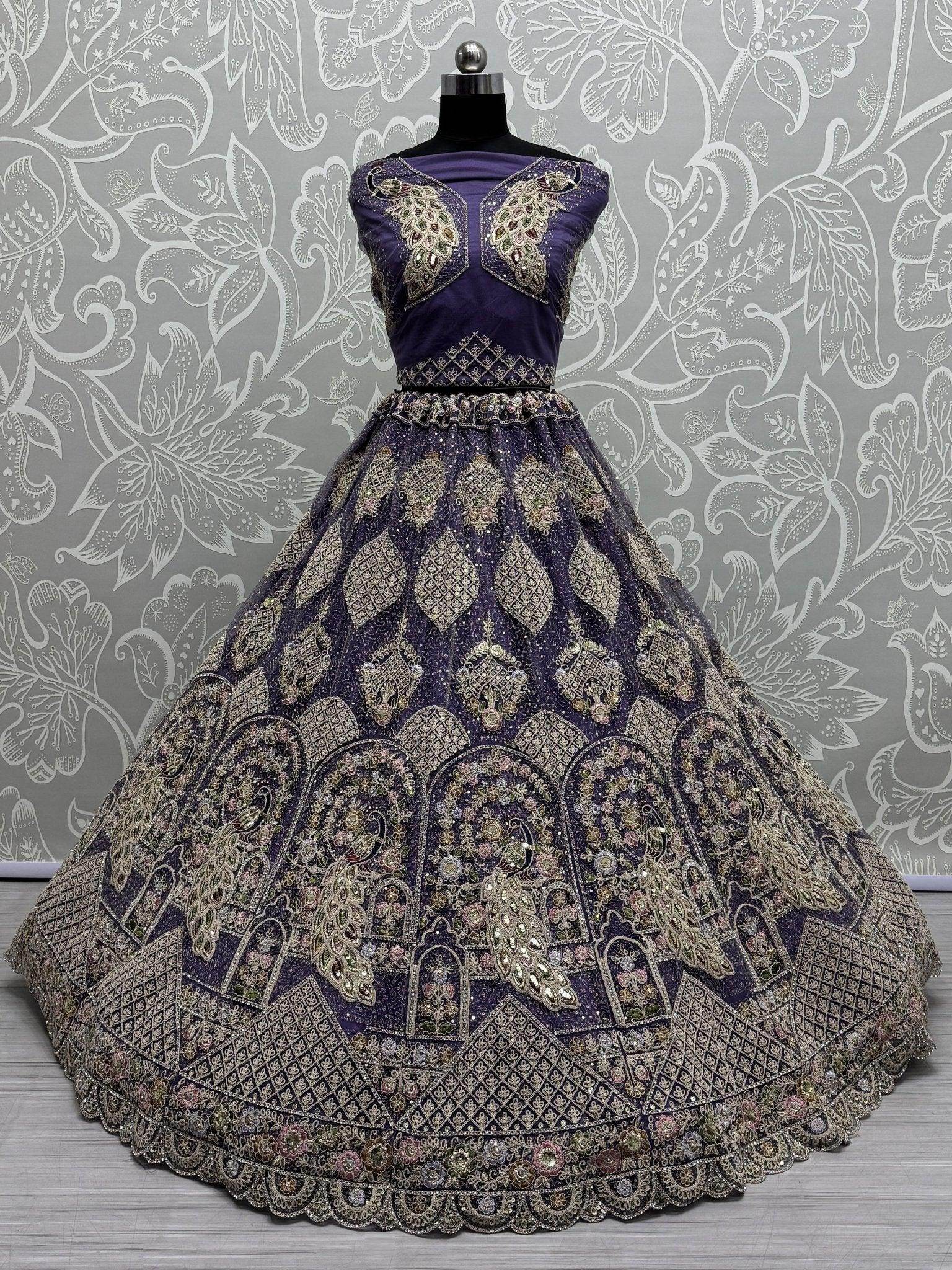 The purple lehenga is crafted from soft net fabric and showcases an exquisite peacock pattern. It features heavy button dori, multi-thread and zari embroidery, sequins, and diamond embellishments for a regal finish.