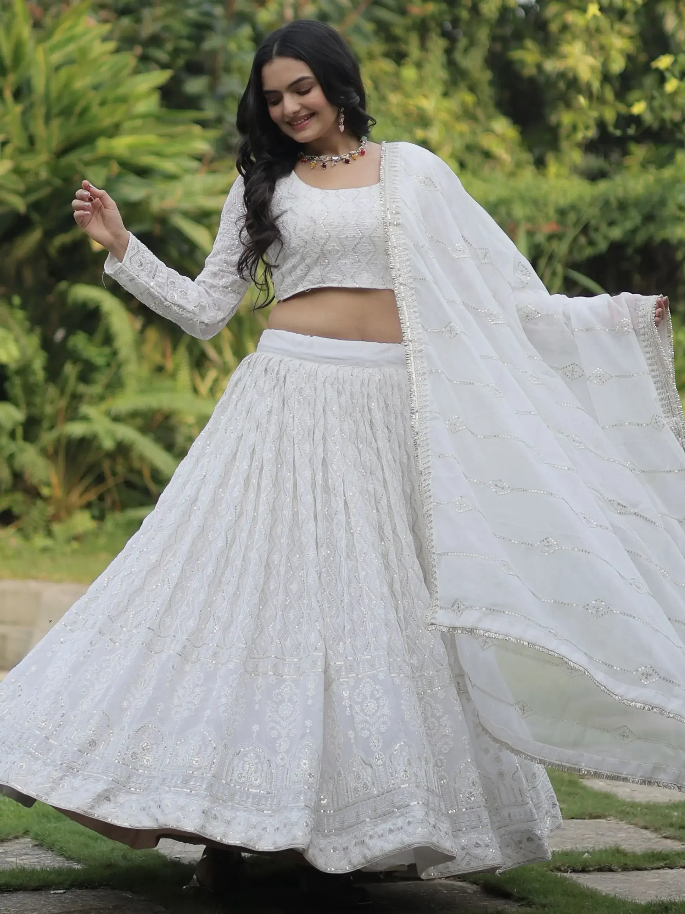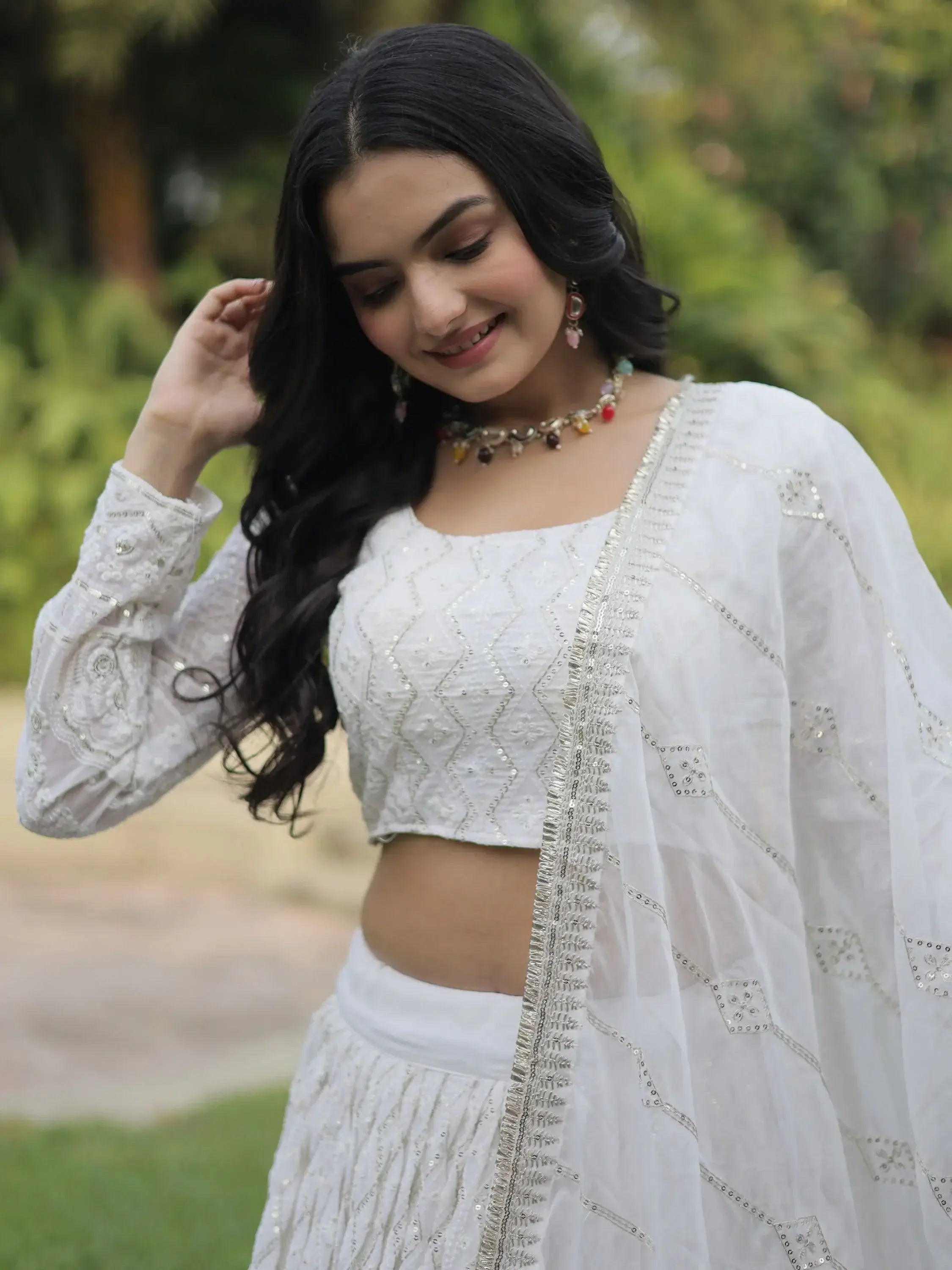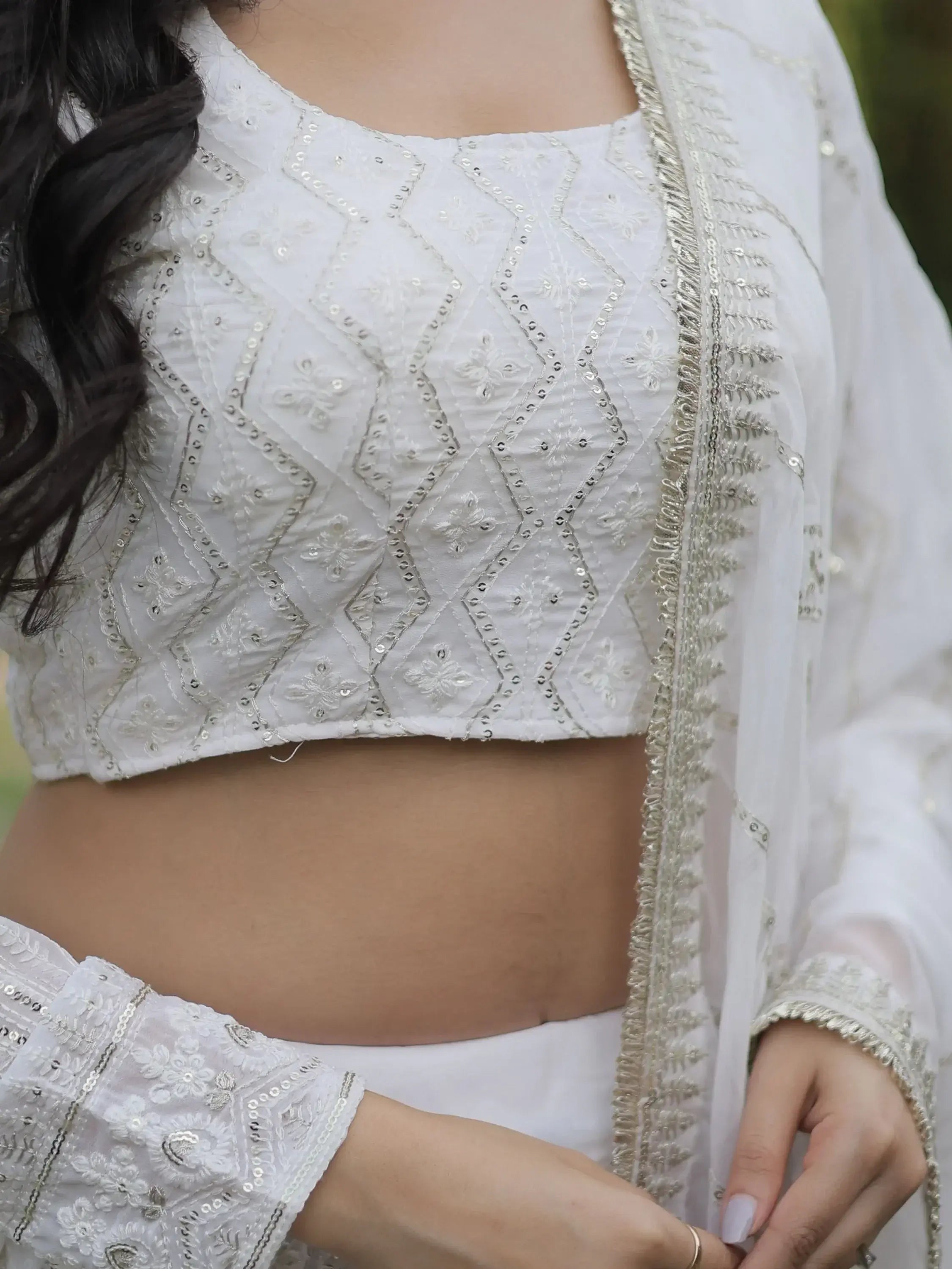 Indulge in timeless elegance with this exquisite white georgette lehenga adorned with intricate thread embroidery and heavy sequin work. Paired with a matching georgette choli featuring delicate sequin and thread embroidered details, and complemented by a georgette dupatta showcasing stunning thread embroidery, sequin work, and a beautiful lace border, this ensemble is a vision of sophistication and grace.