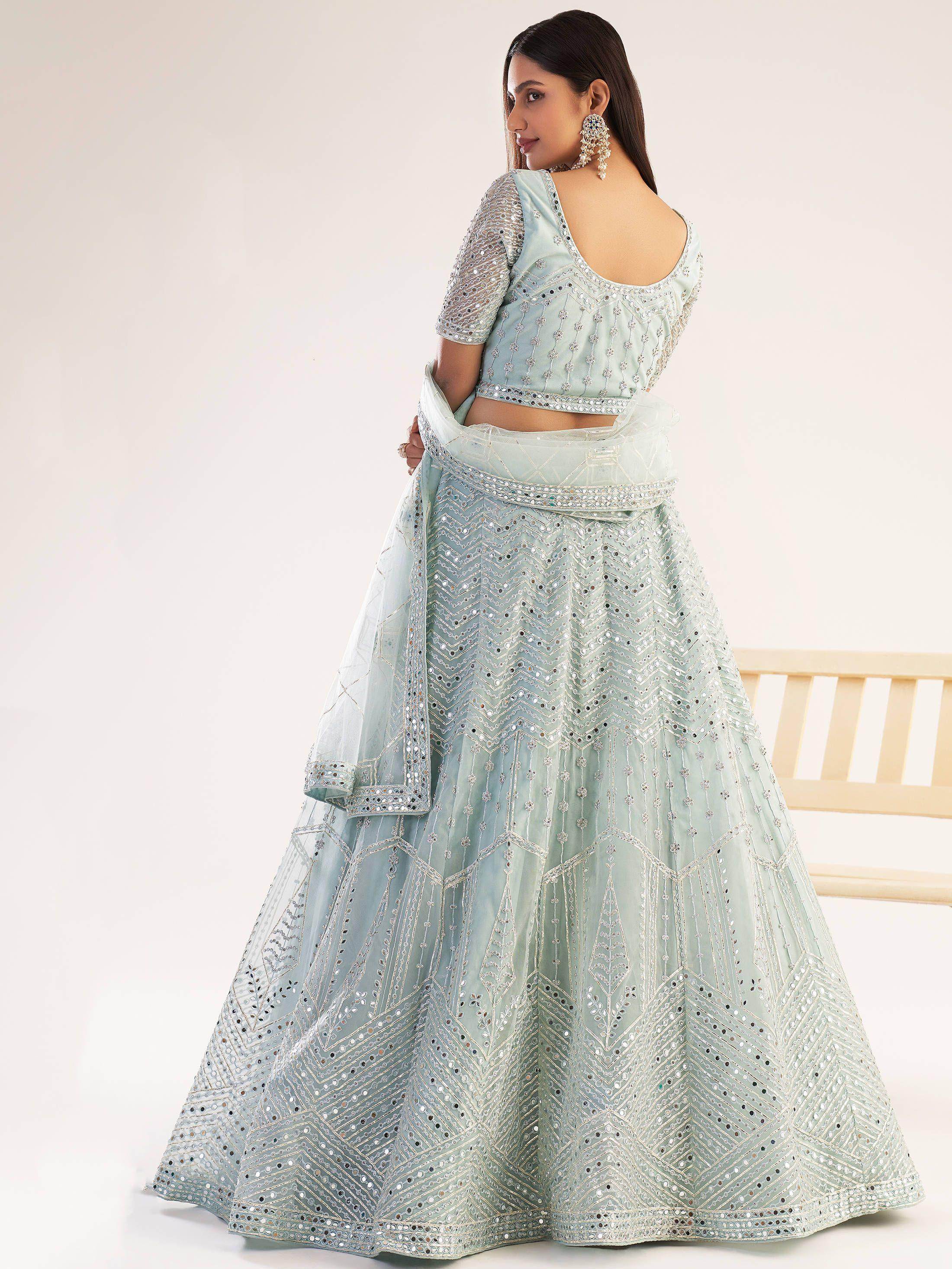This blue wedding wear lehenga is semi-stitched can be customized up to 42 inch comes with fully unstitched choli material.