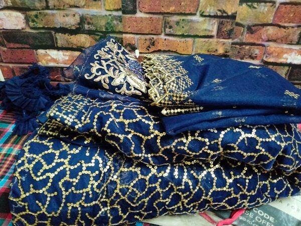 This navy blue wedding wear lehenga is semi-stitched and can be customized up to 42 inch comes with fully unstitched choli material.
