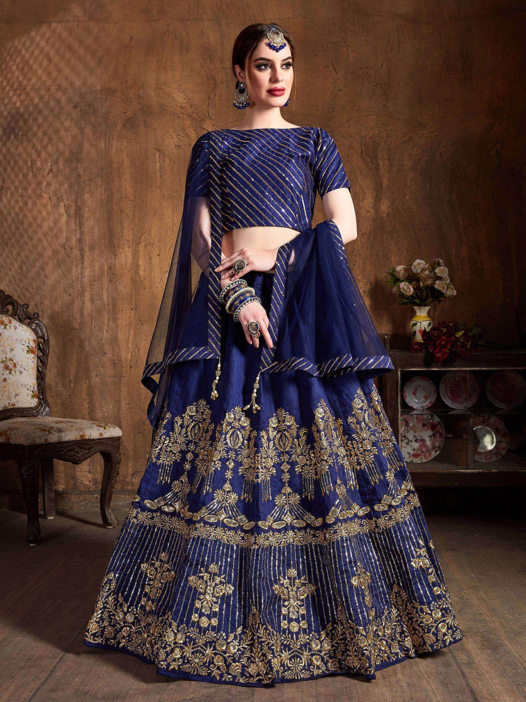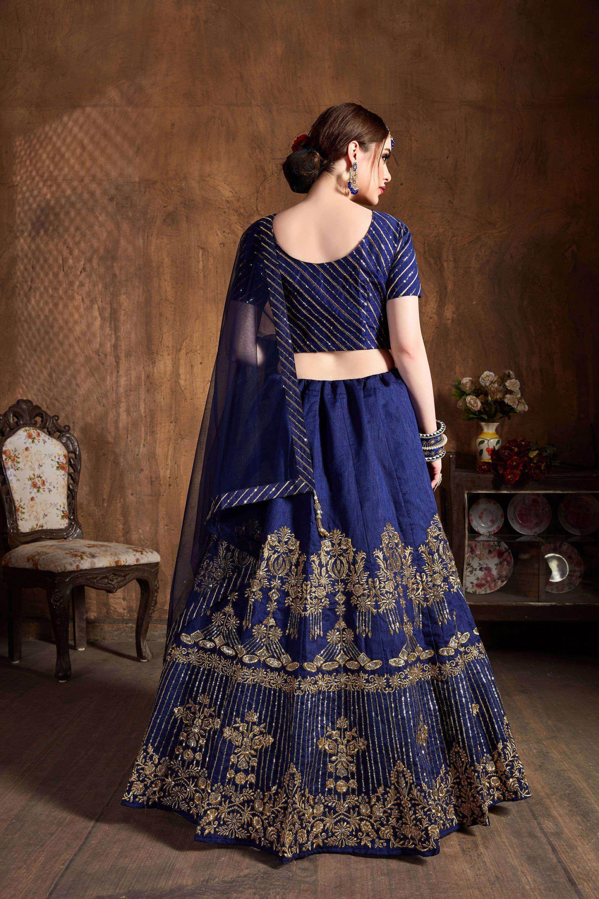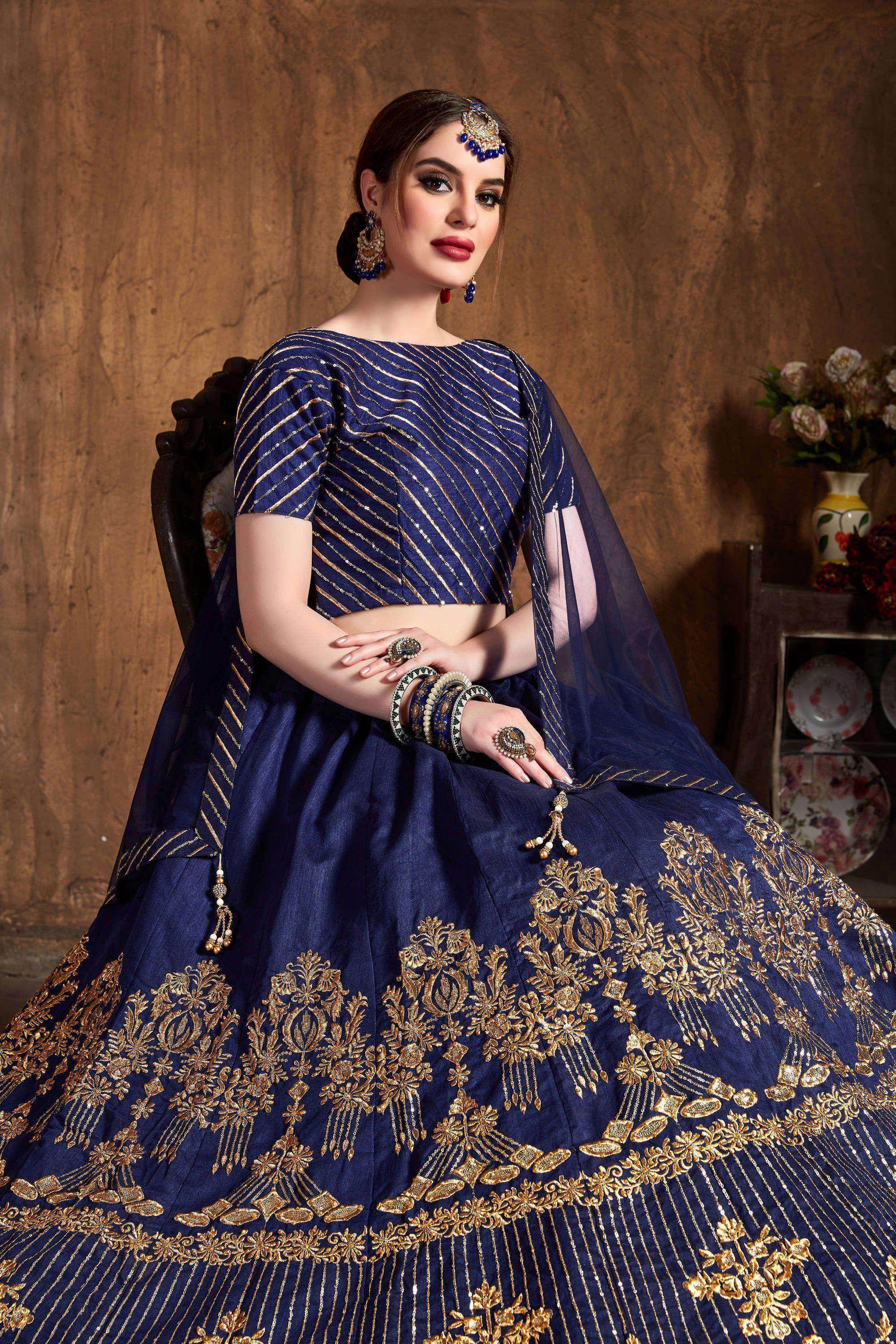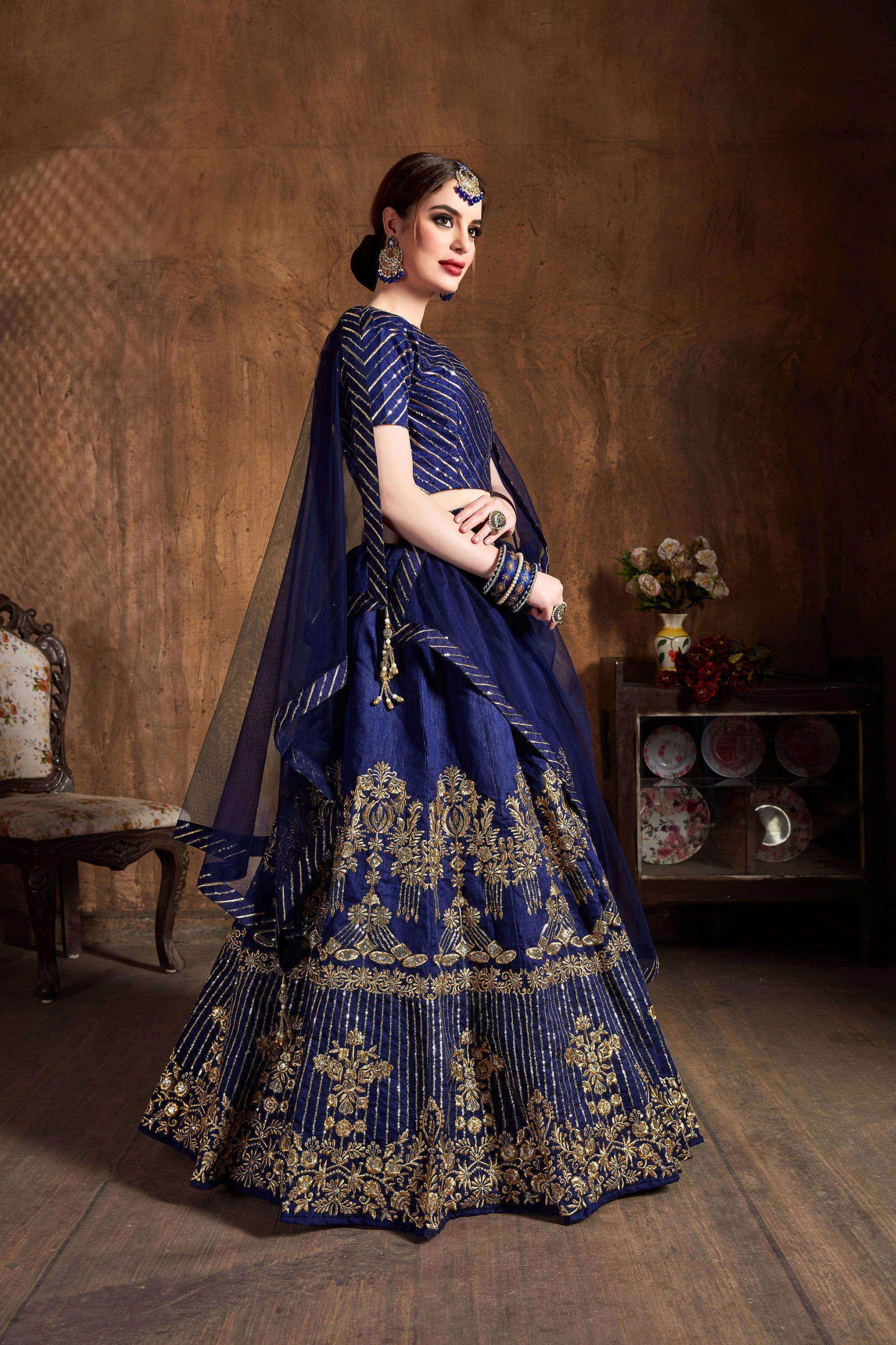 Look gorgeous in this stunning blue colored bridal art silk bridal wedding lehenga for women designed with floral zari embroidery all over enhanced by sequins & stone embellishments.