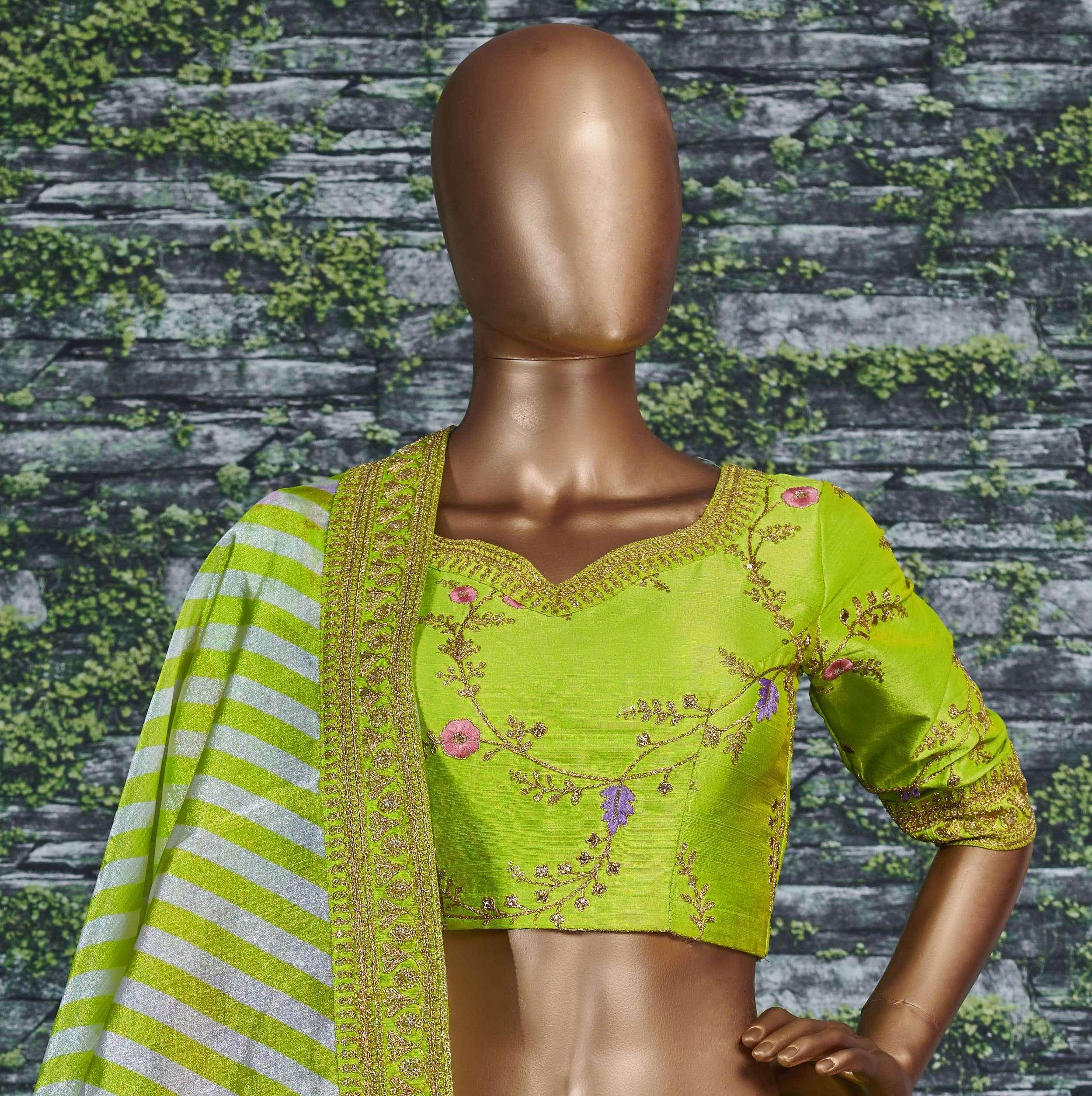 Make a striking statement in this Neon green Mulberry Silk bridal wedding sabyasachi designer lehenga decked with zari embroidery, stone work and lace.