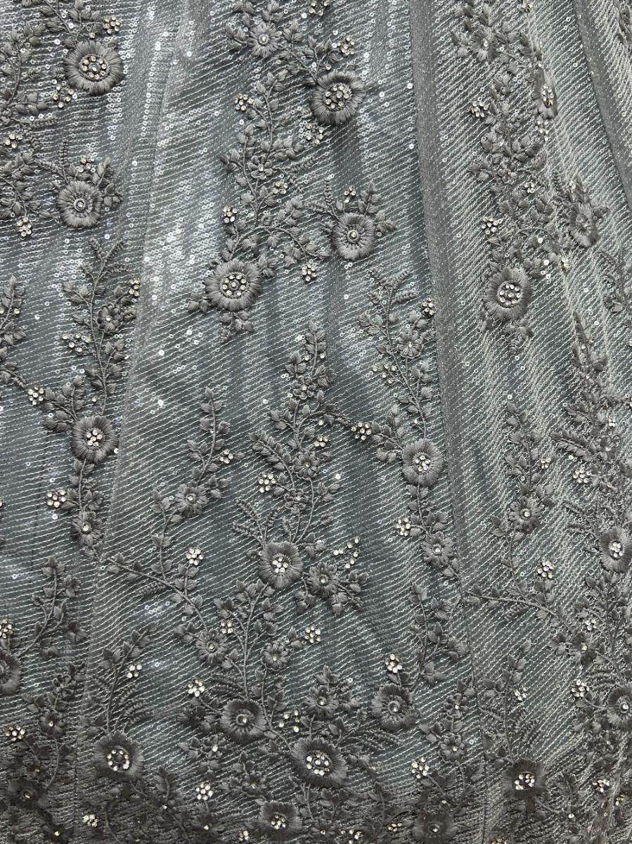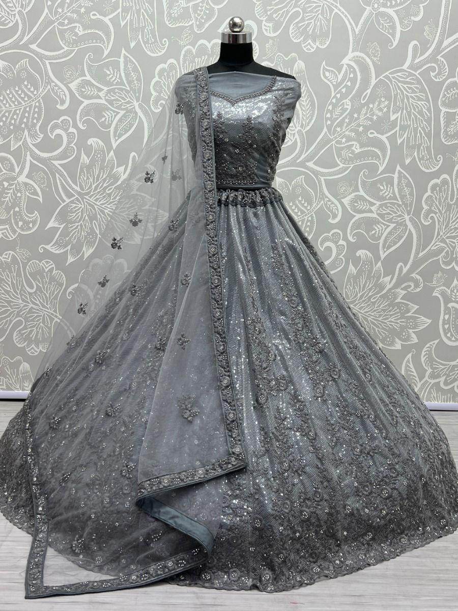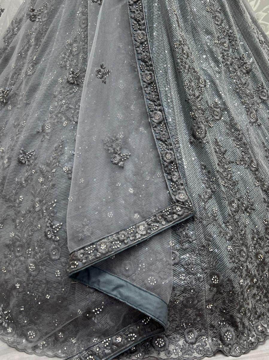 Be a stunner and make your fashion game stronger by wearing this chic grey color sequin lehenga choli. This grey color lehenga is made of bridal net material embellished with zircon diamond work, thread embroidery, and background sequin work and is also attached with a standard cancan & canvas.