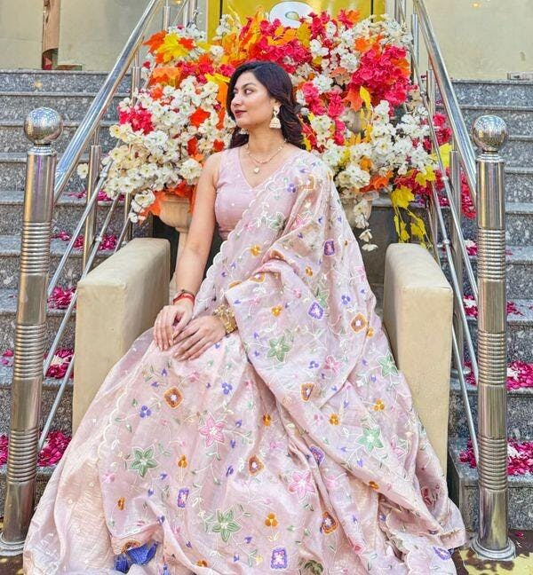 Step into elegance with this outstanding light pink lehenga in gold crush silk, crafted for weddings, receptions, and grand parties. The soft sheen of the fabric is beautifully enhanced with sequins and delicate floral thread embroidery, giving it a rich and festive feel.