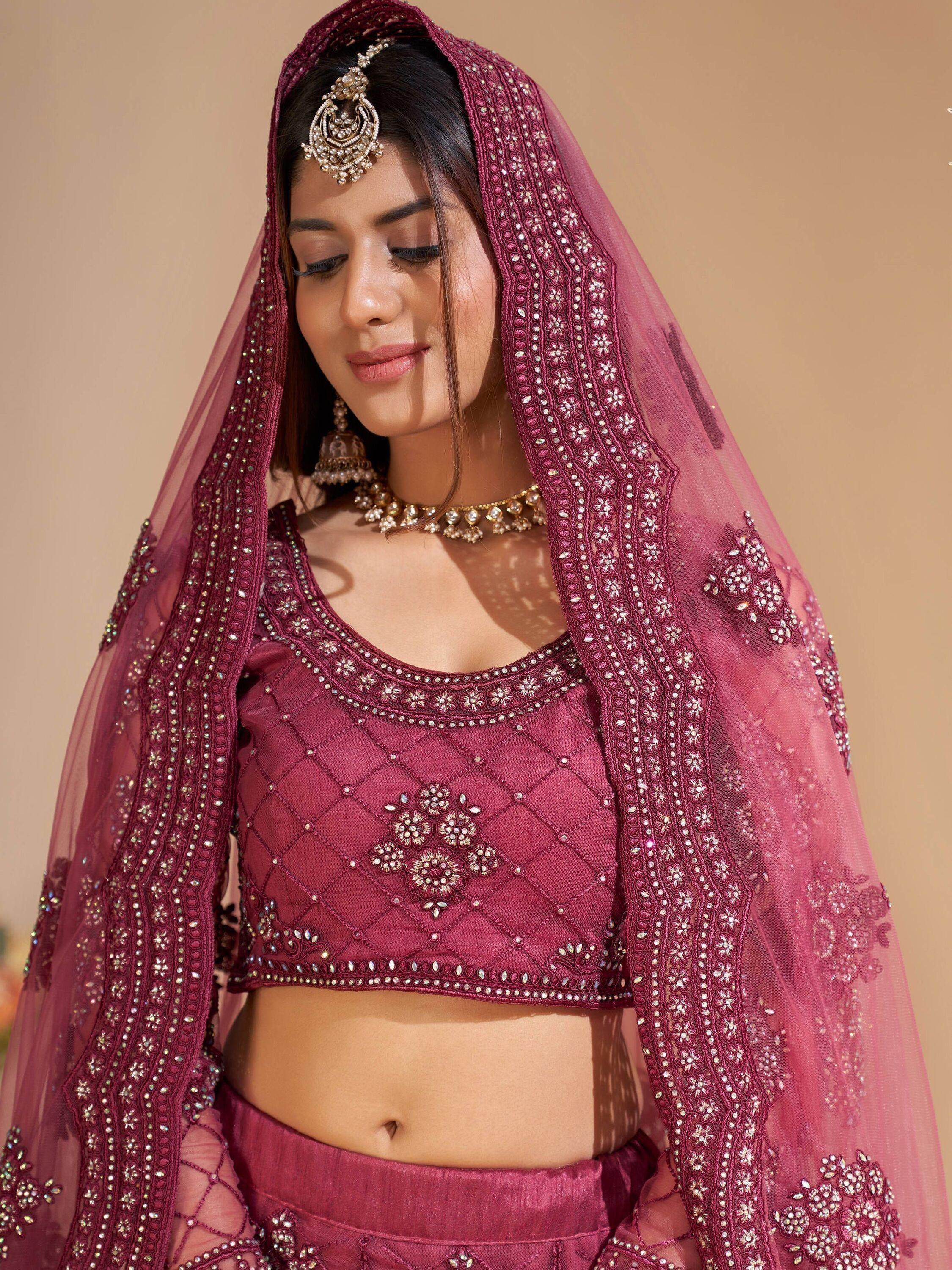 This lehenga comes with a maroon color choli in net material and a maroon net dupatta with cording, stone, and thread embroidery work border.