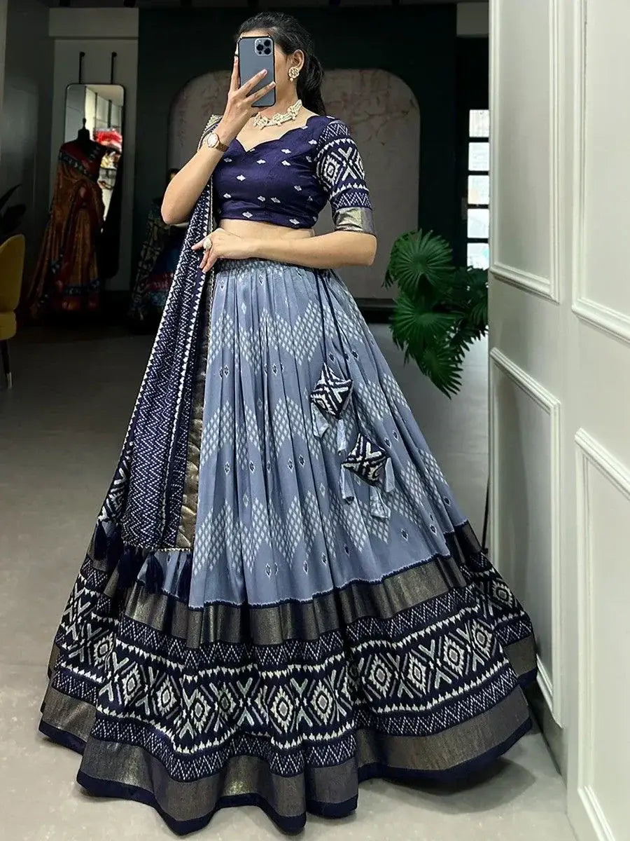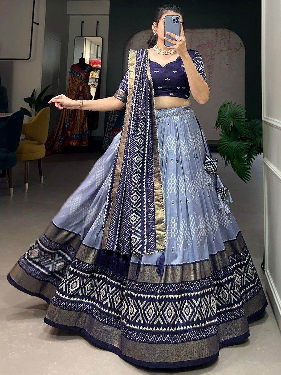 Introducing our outstanding navy blue sequins silk festival wear lehenga choli, a luxurious ensemble that will make you the center of attention on every occasion. Made from high-quality tussar silk material, this lehenga is designed to mesmerize with its stunning digital print work and foil work. The rich navy blue color adds a touch of elegance, making it perfect for festive celebrations like Navratri.