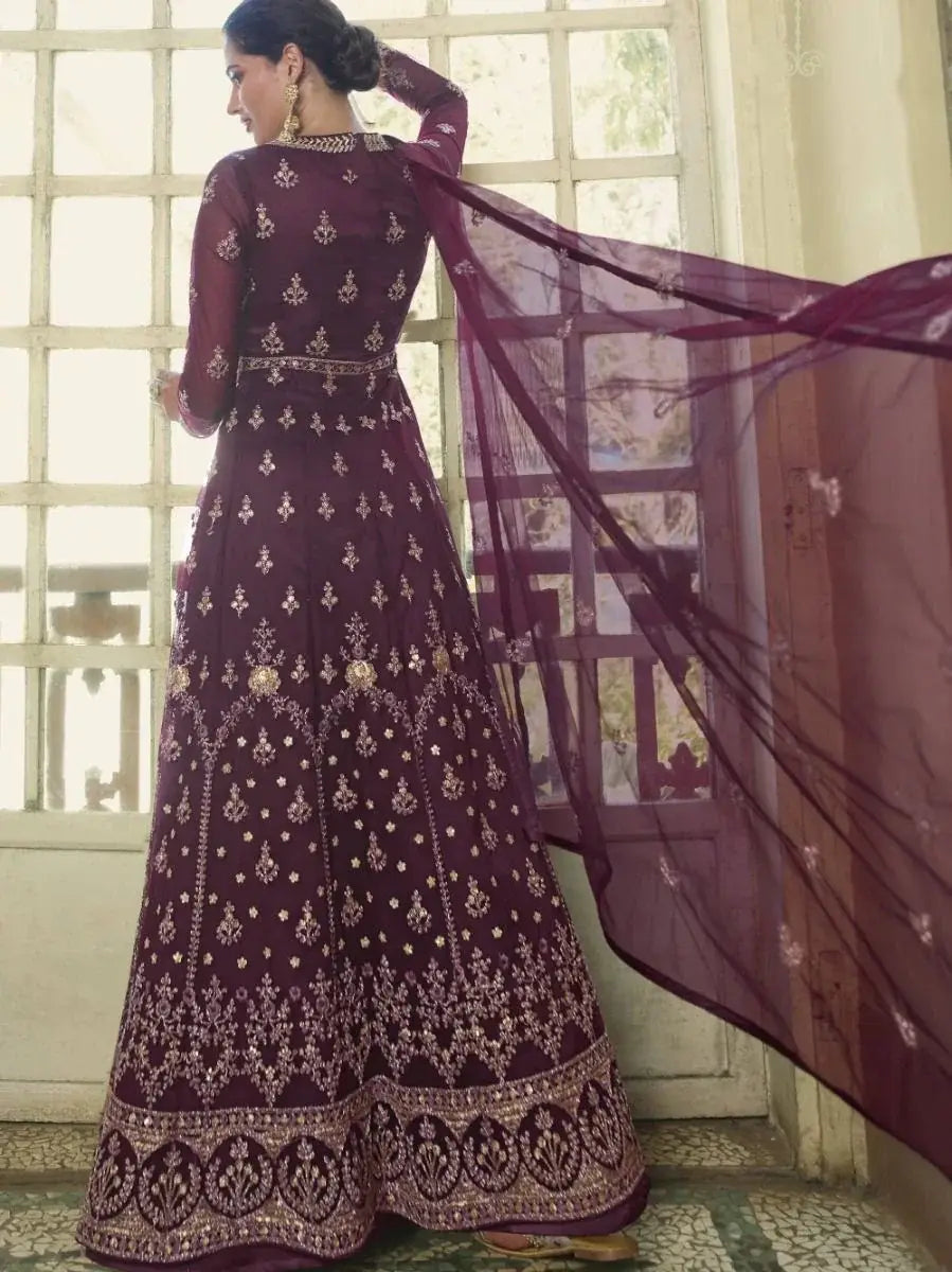 Spread the aura of freshness with this prominent purple color gown. This purple color gown is made of butterfly net material with inner satin and created with zari embroidery and sequence work.