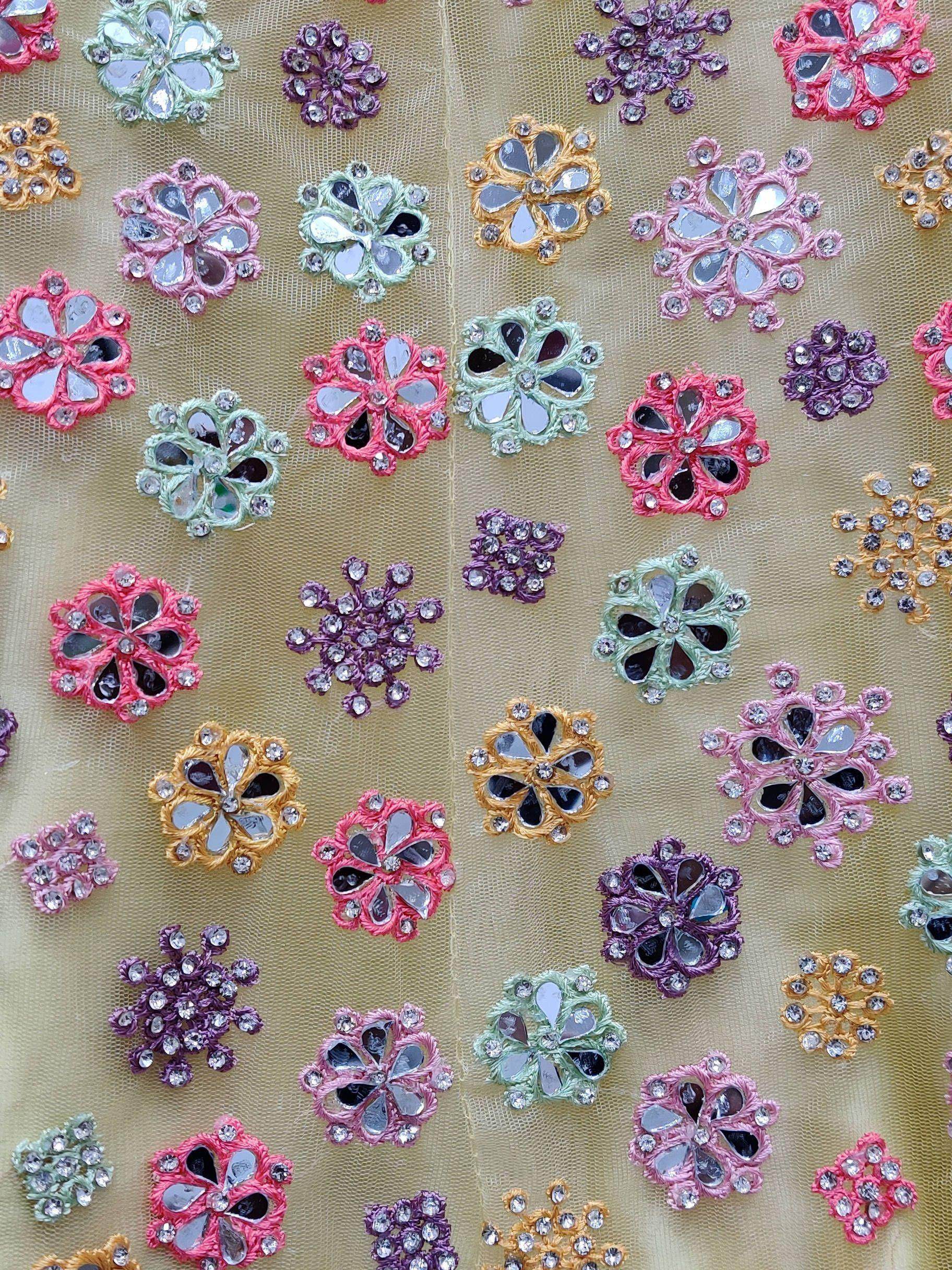 Create an opulent effect with your fashion sense by wearing this elegant yellow color lehenga made of net material embellished by mirror work, multi-color thread work, handwork, diamond work.