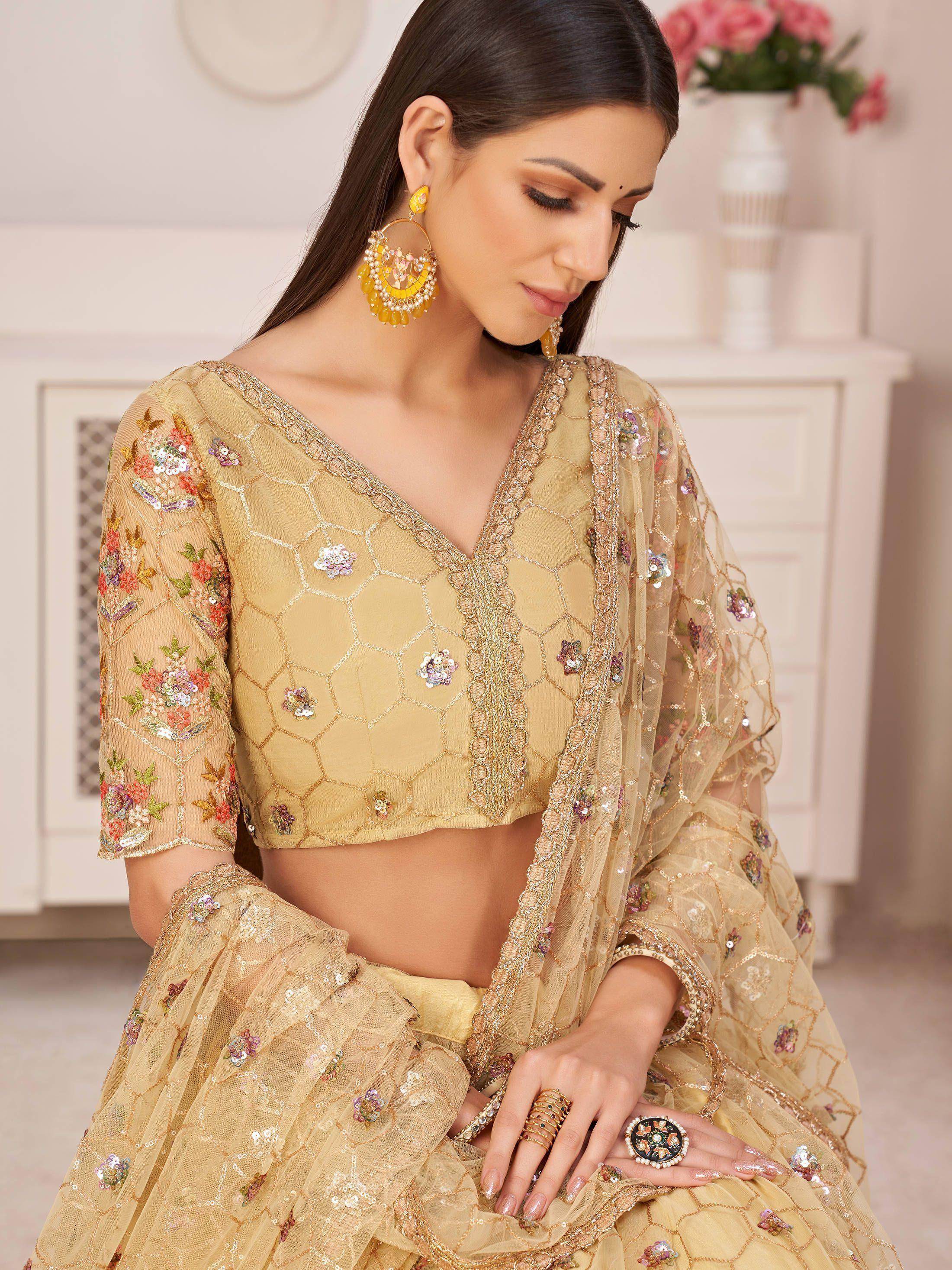 Lehenga comes in a similar color choli in net material with santoon inner and mono net dupatta featured with thread embroidery, zari, and sequins work all over.