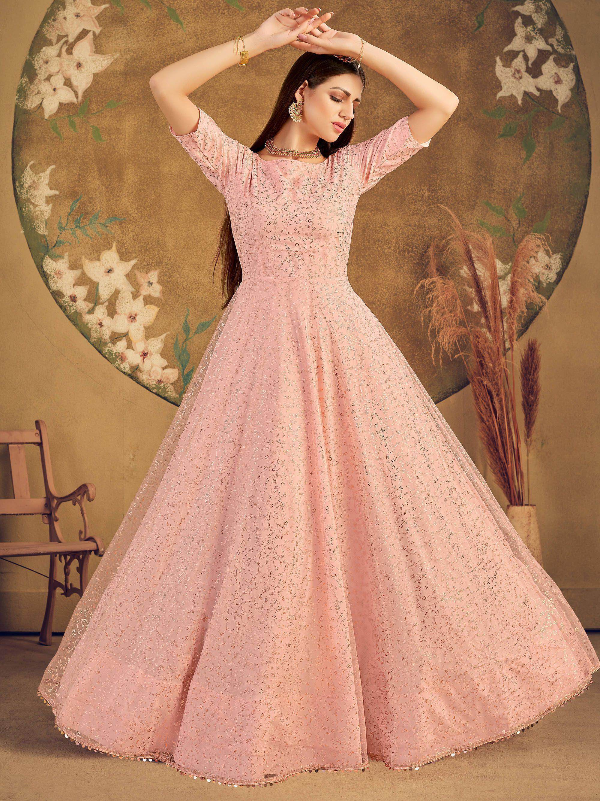 Steal the show donning this peach color gown in net material beautified with all-over metallic foil work comes with crepe inner.