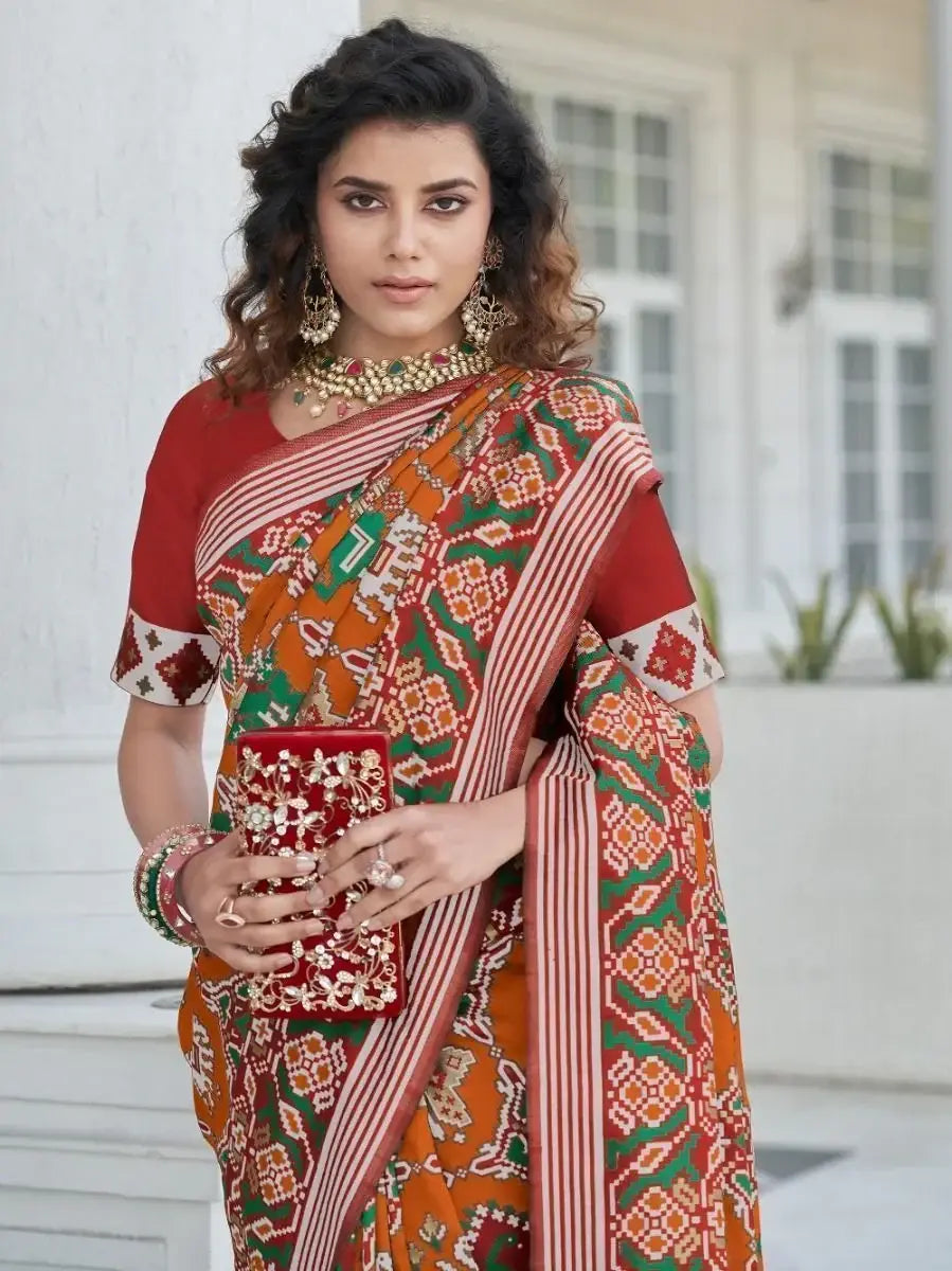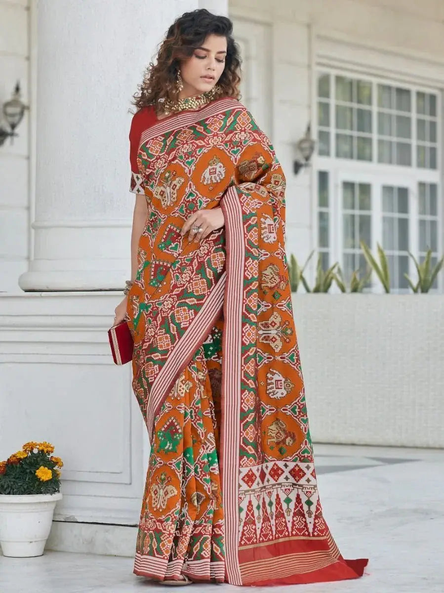 Add an adolescent burst of color to your outfit by wearing this extraordinary dusty orange-colored silk material saree beautified with lovely zari work and patola weaving all over the saree.