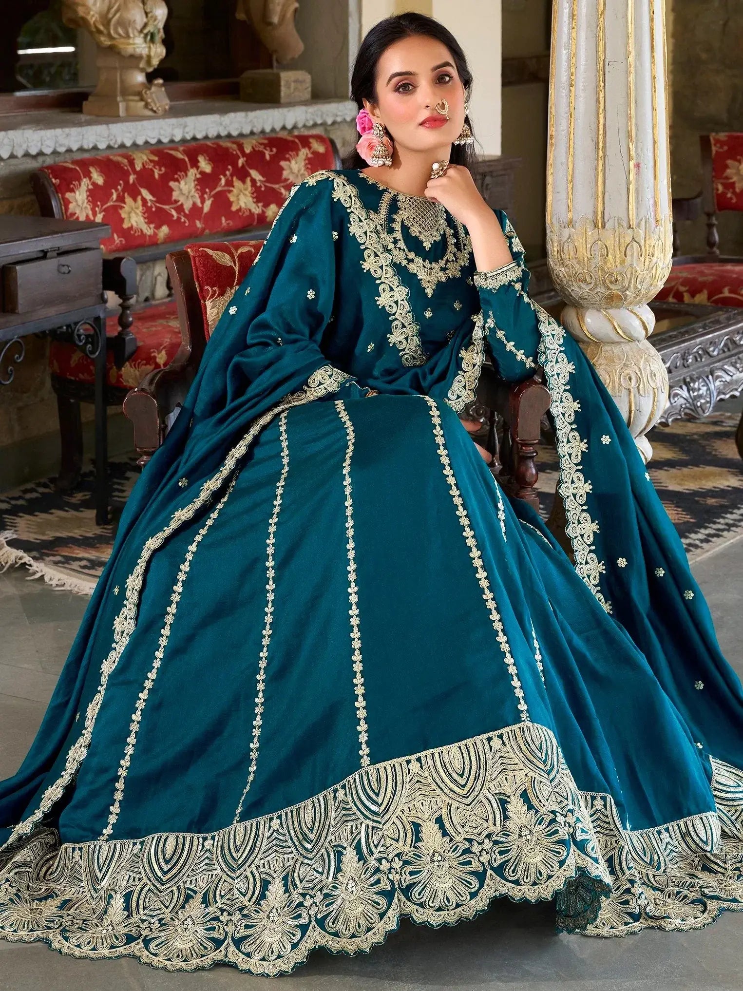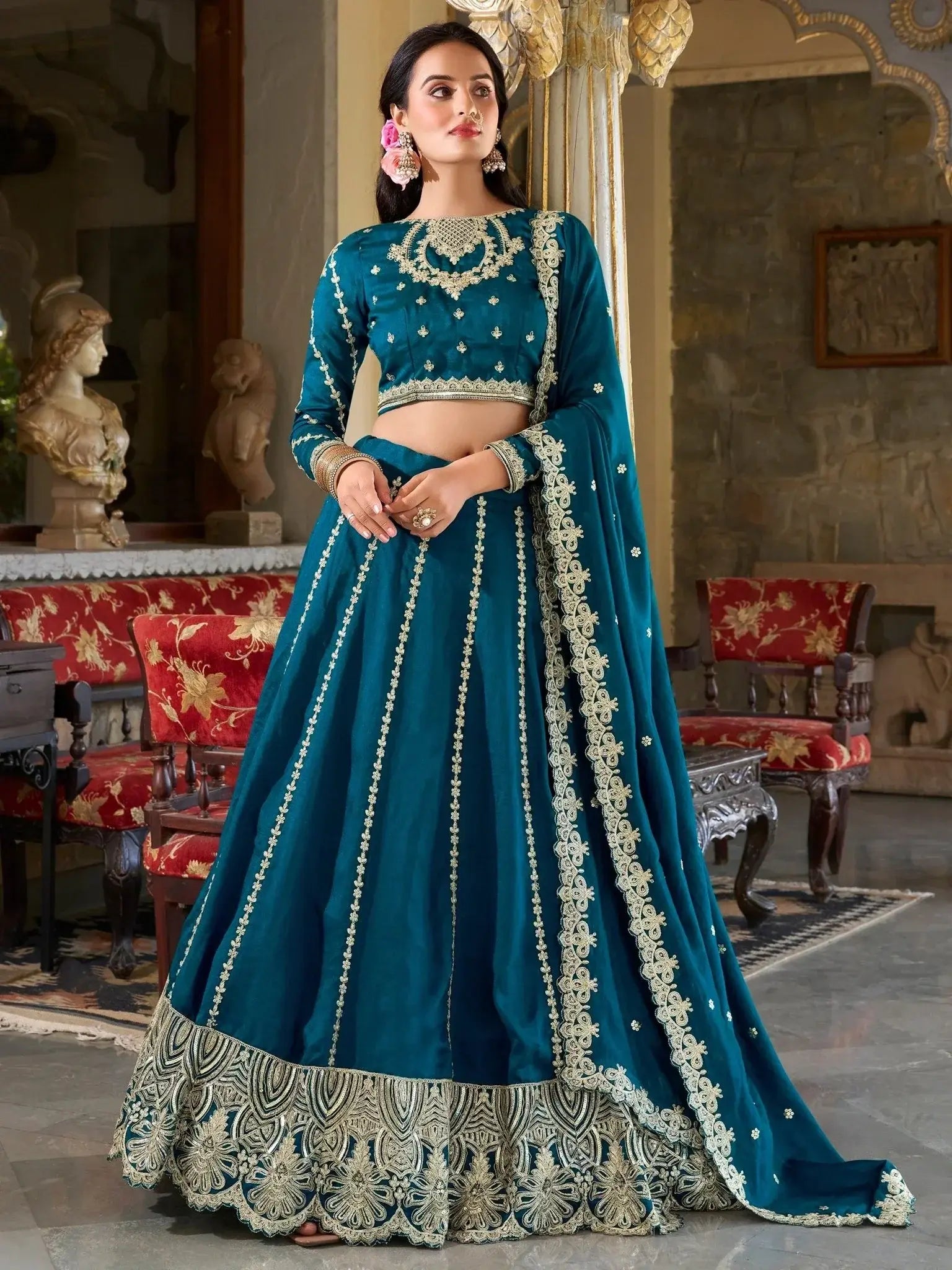 Step into your special occasion with elegance in this phenomenal teal blue vichitra silk stitched lehenga. Designed for engagement and wedding events, it features intricate sequins and thread embroidery that bring a rich, festive touch to the look.