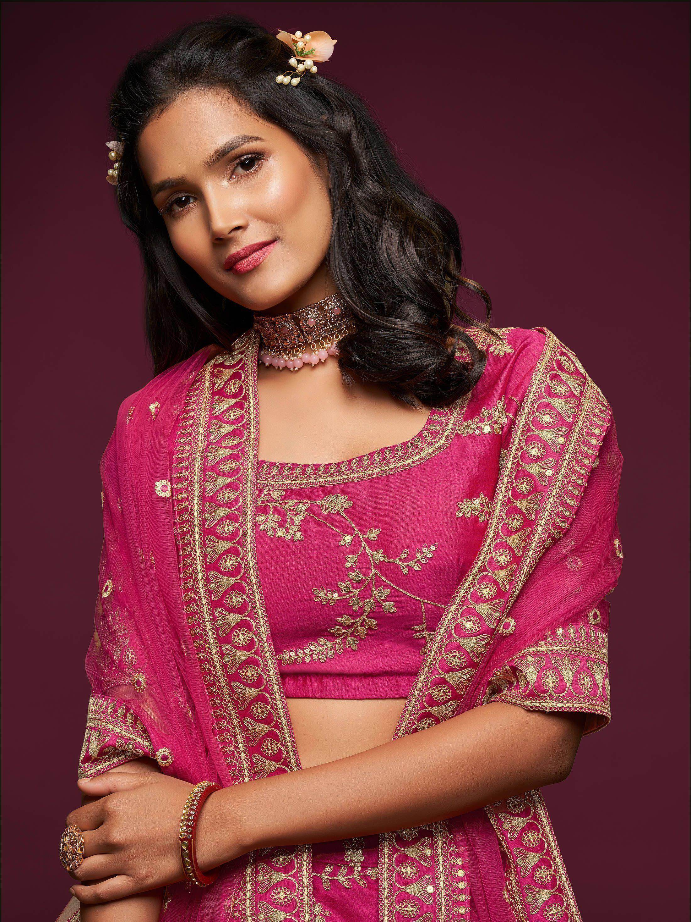 Create a smoldering impact by this pink wedding wear lehenga made of art silk material beautifully crafted with thread, zari embroidery, sequins work, and dori work all overcomes with attached can-can inside.