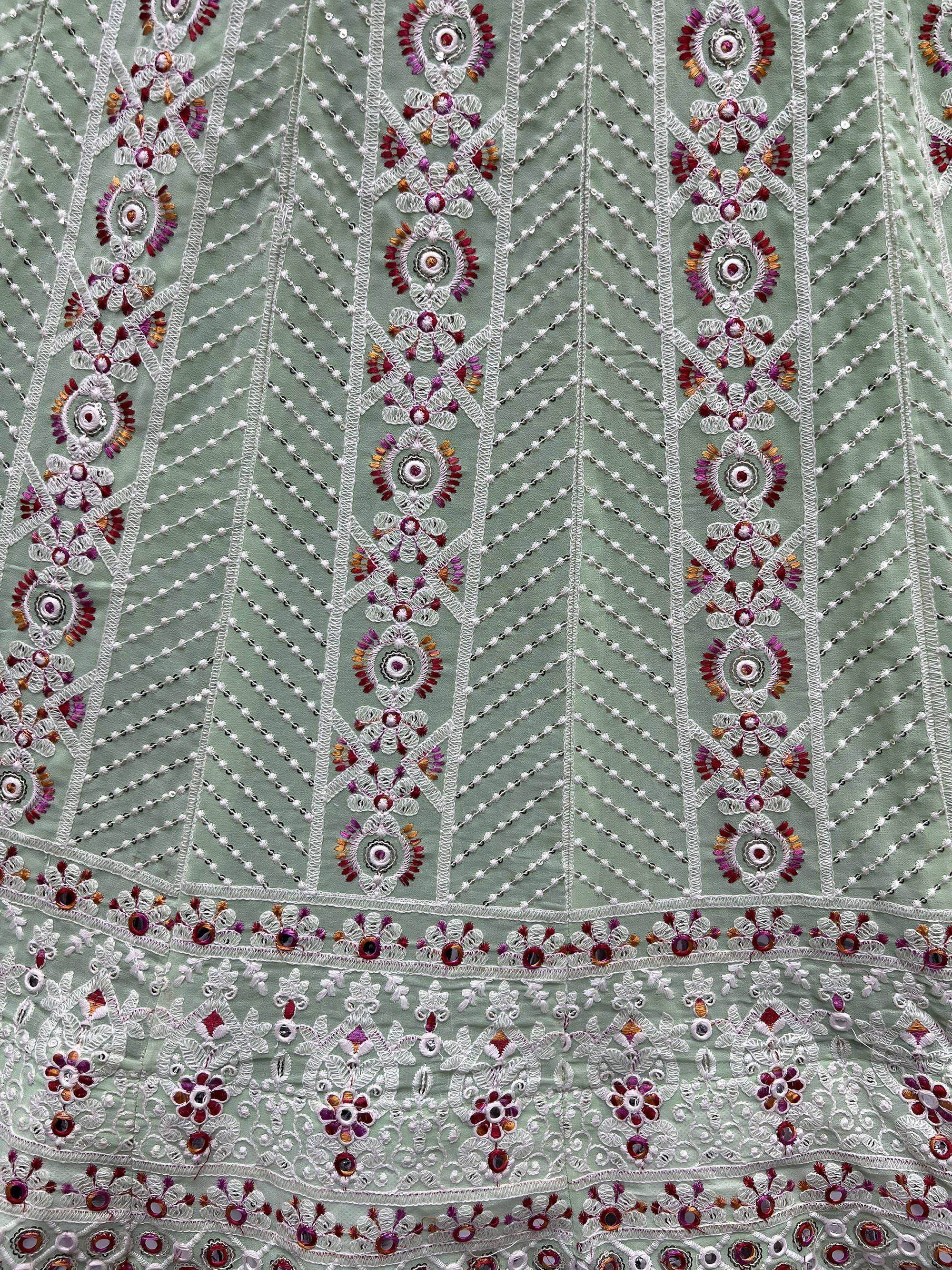 Grab the second look in this elegant attire for this season. Add a vibrant burst of color to your wardrobe with this pista green color georgette material wedding wear lehenga choli embellished with dori, sequins, and thread foil mirror with floral embroidered work on the attire adds a sign in beauty statement to your look.