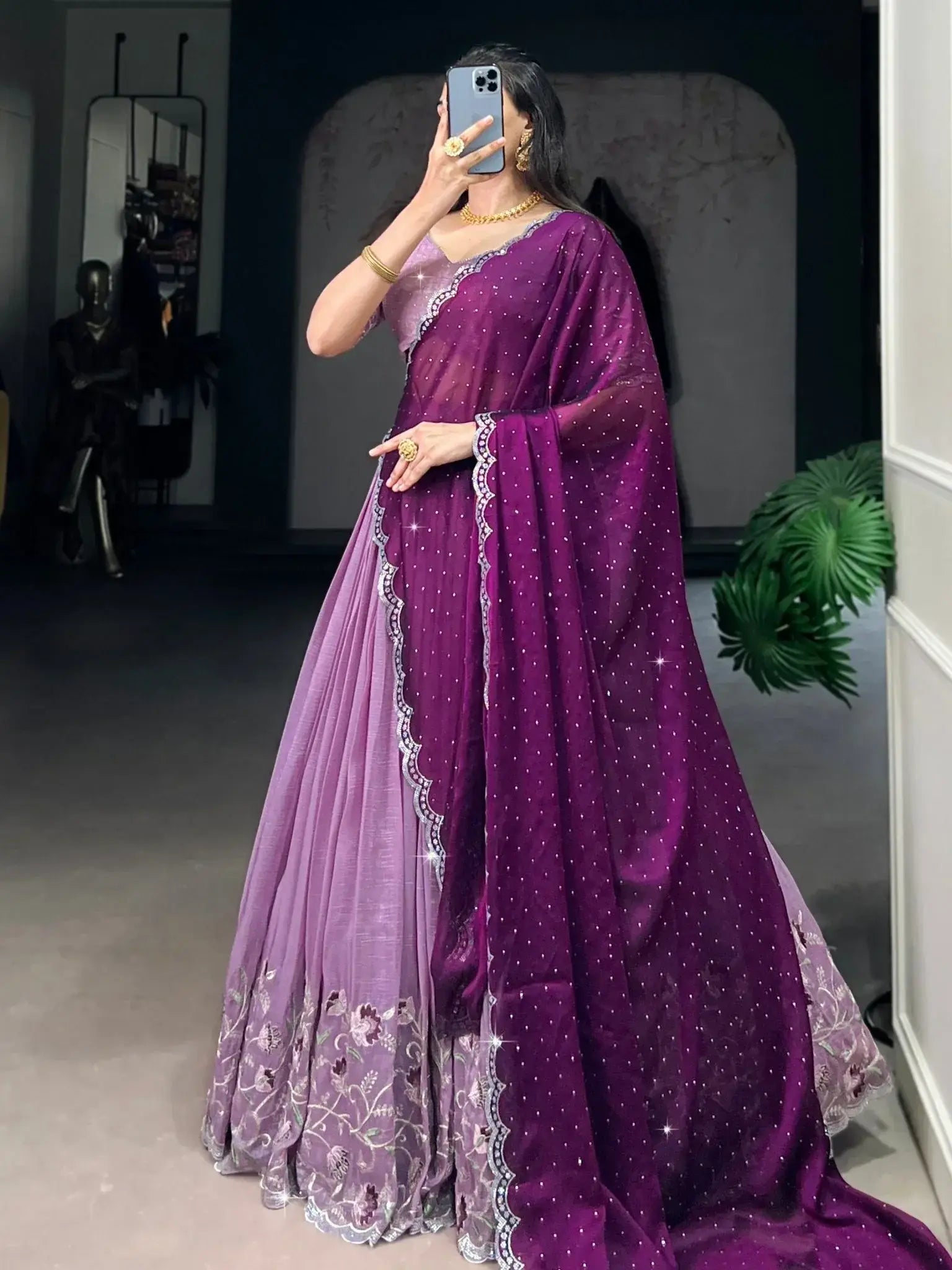 Radiate charm and grace at any wedding celebration with this pleasant Lavender Organza stitched lehenga. Designed with intricate Mukkai Hotfix, delicate sequins, and fine thread embroidery, this lehenga brings together elegance and sparkle. Its soft flow and 41-inch length, with stitching support up to 42 inches, make it as comfortable as it is eye-catching.