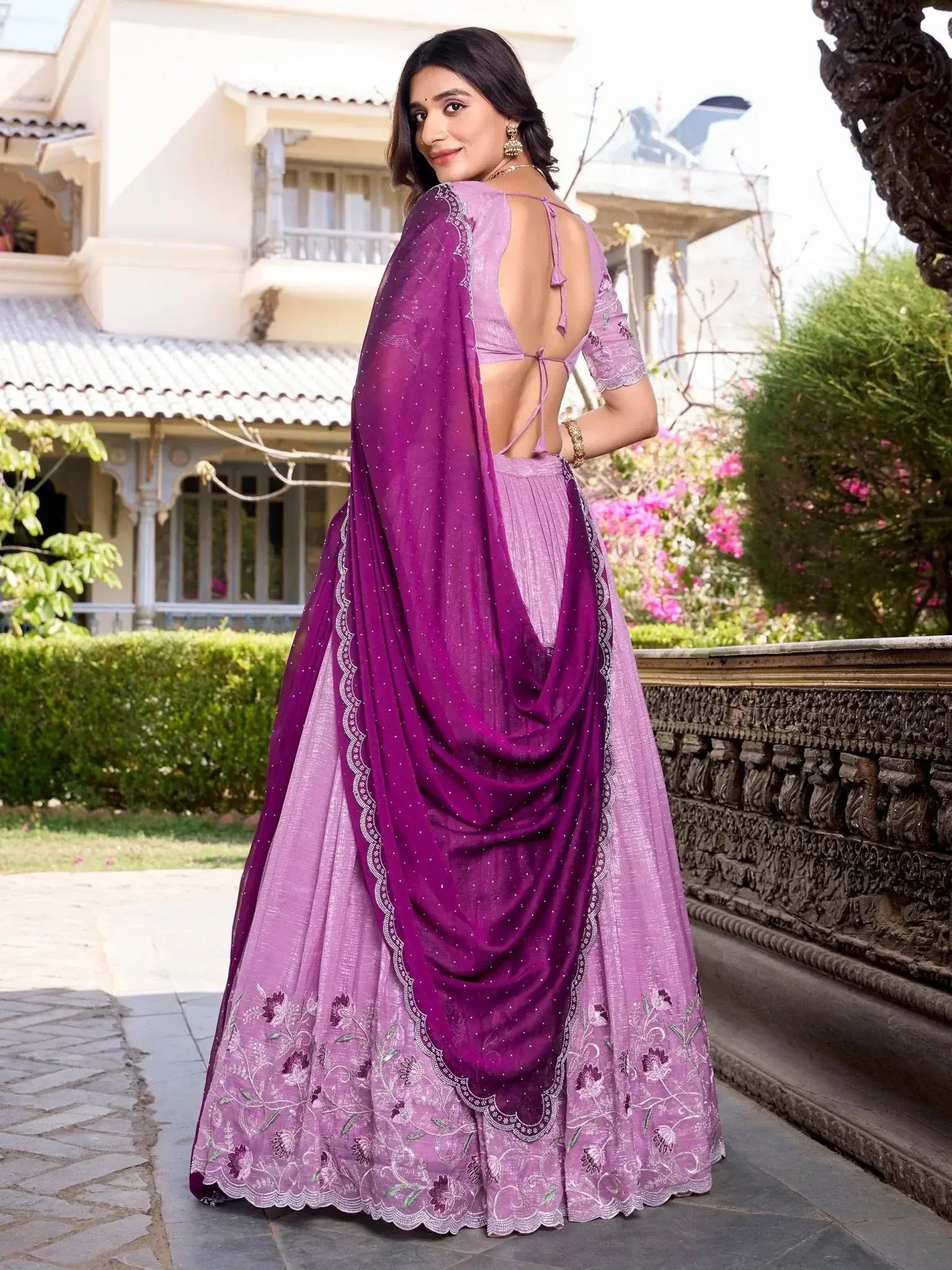 Completing the outfit is a rich purple silk dupatta, embellished with hotfix work that adds a vibrant contrast to the soft lavender tones. The luxurious silk and sparkling details elevate the overall appeal, making this lehenga set a perfect choice for function wear with a regal and festive touch.