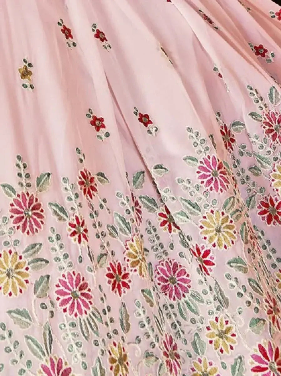 Add richer looks to your personality in this wondrous peach color lehenga made with georgette material completed with sequin work and thread embroidery.