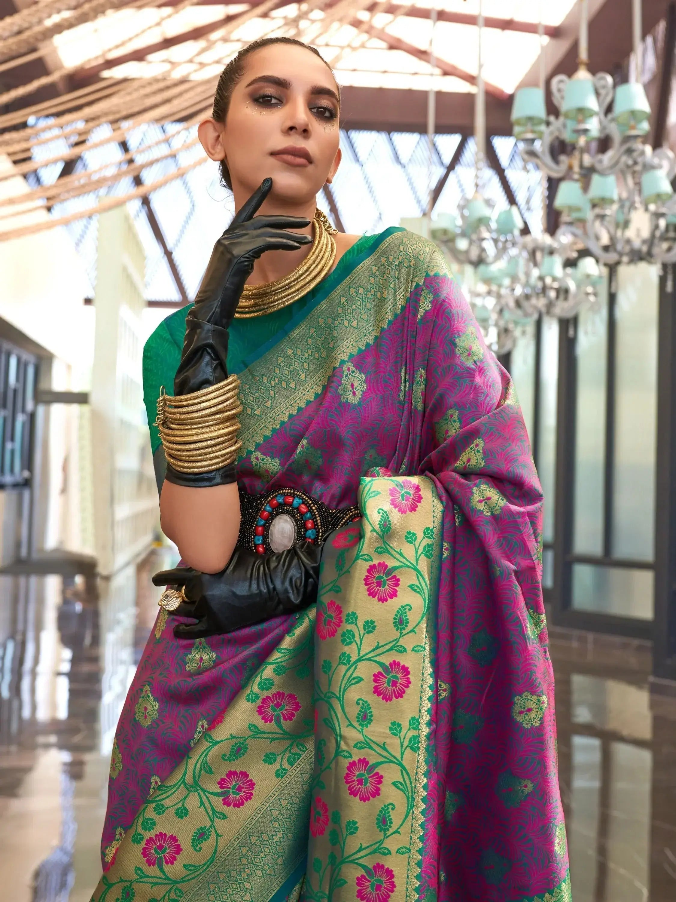 Accompanying the saree is a blouse crafted from the same luxurious silk material, featuring intricate zari weaving work in a complementary shade of green. The unstitched blouse material allows for customization, ensuring a perfect fit that enhances your natural beauty and silhouette.