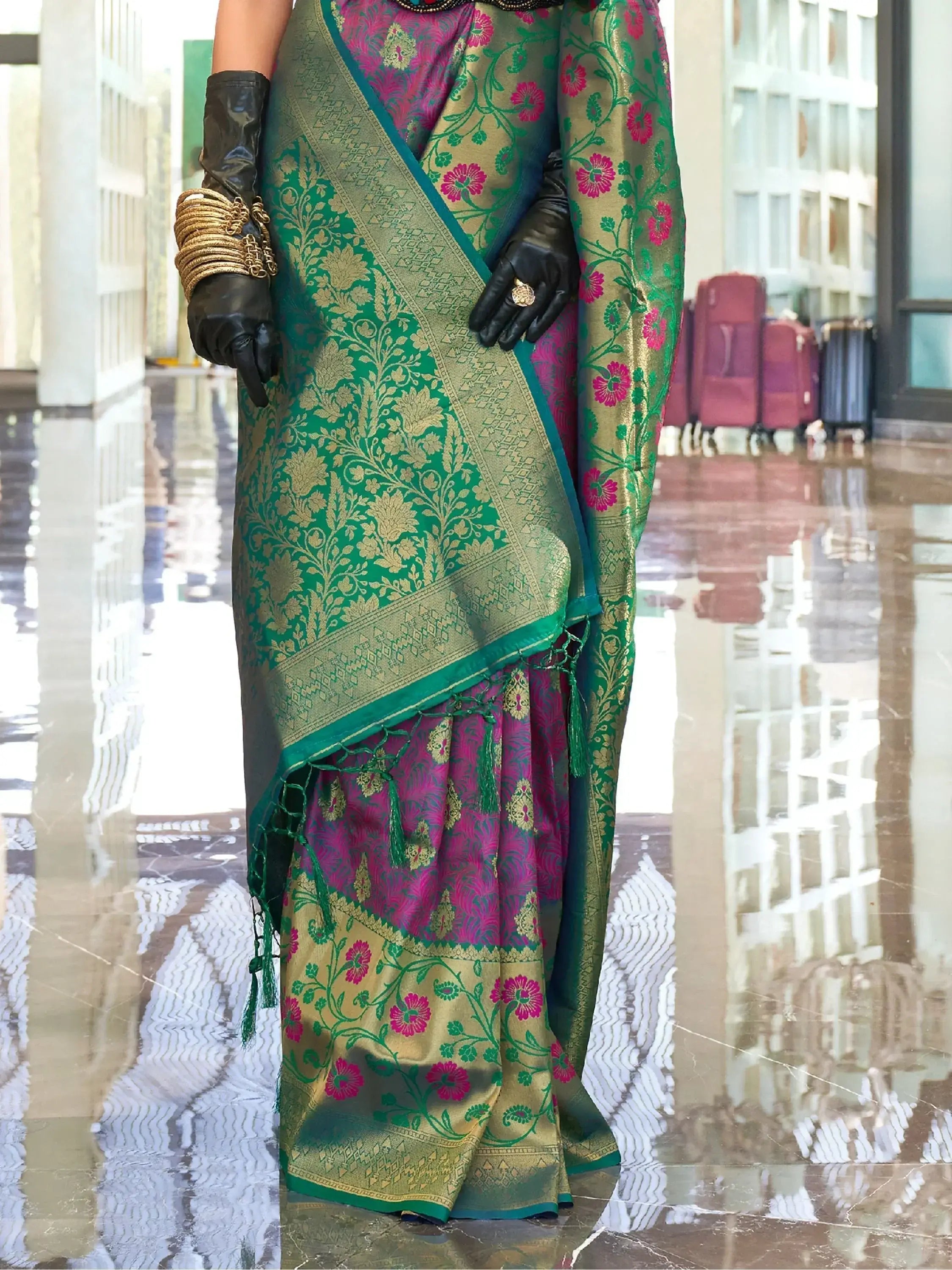 Indulge in the timeless allure of this exquisite silk saree, adorned with intricate zari weaving work in mesmerizing shades of pink and green. Radiating charm, richness, and elegance, this saree epitomizes sophistication, making it the perfect choice for any special occasion. The luxurious silk fabric drapes gracefully, exuding an aura of refinement as you make your grand entrance.