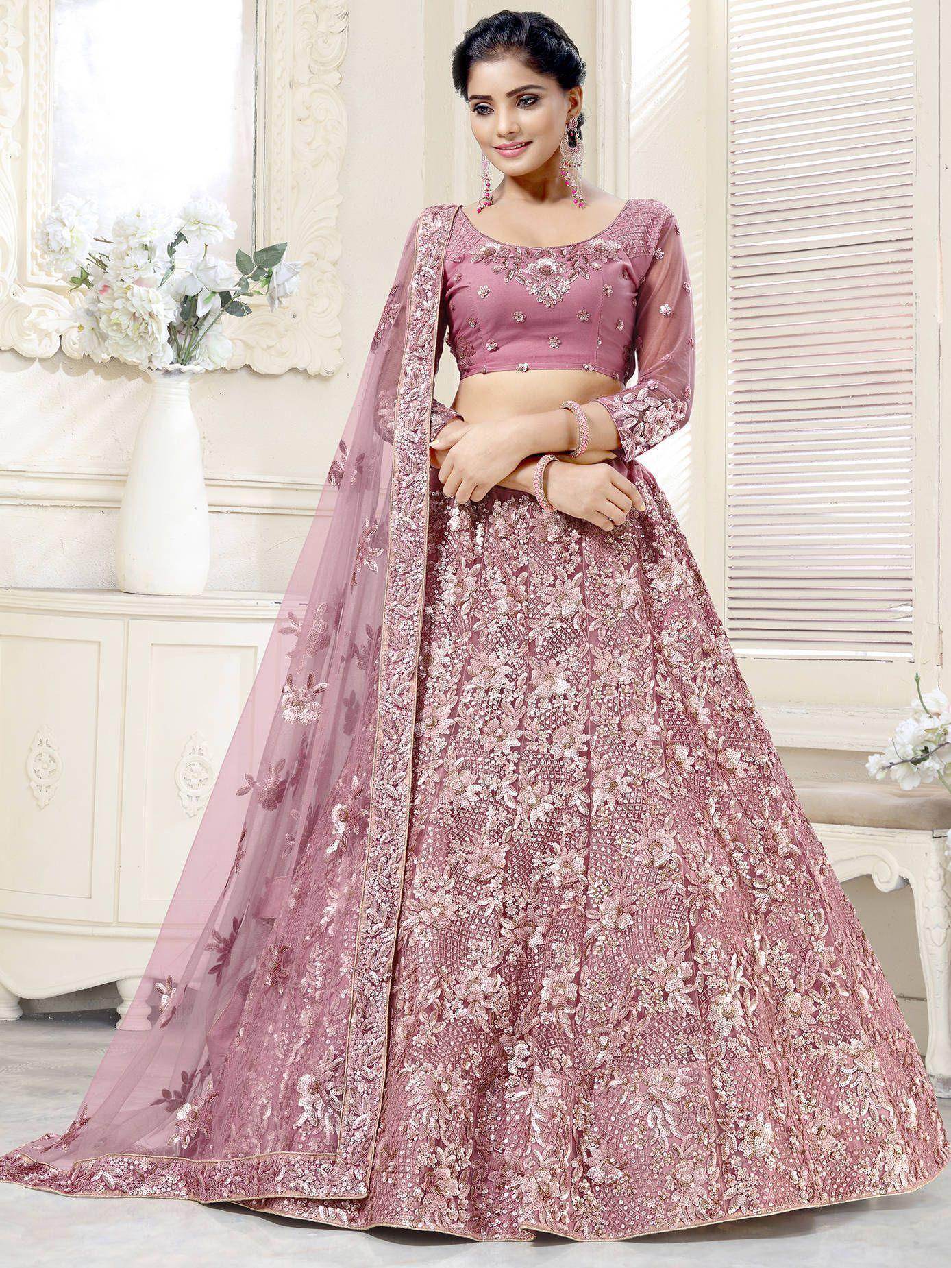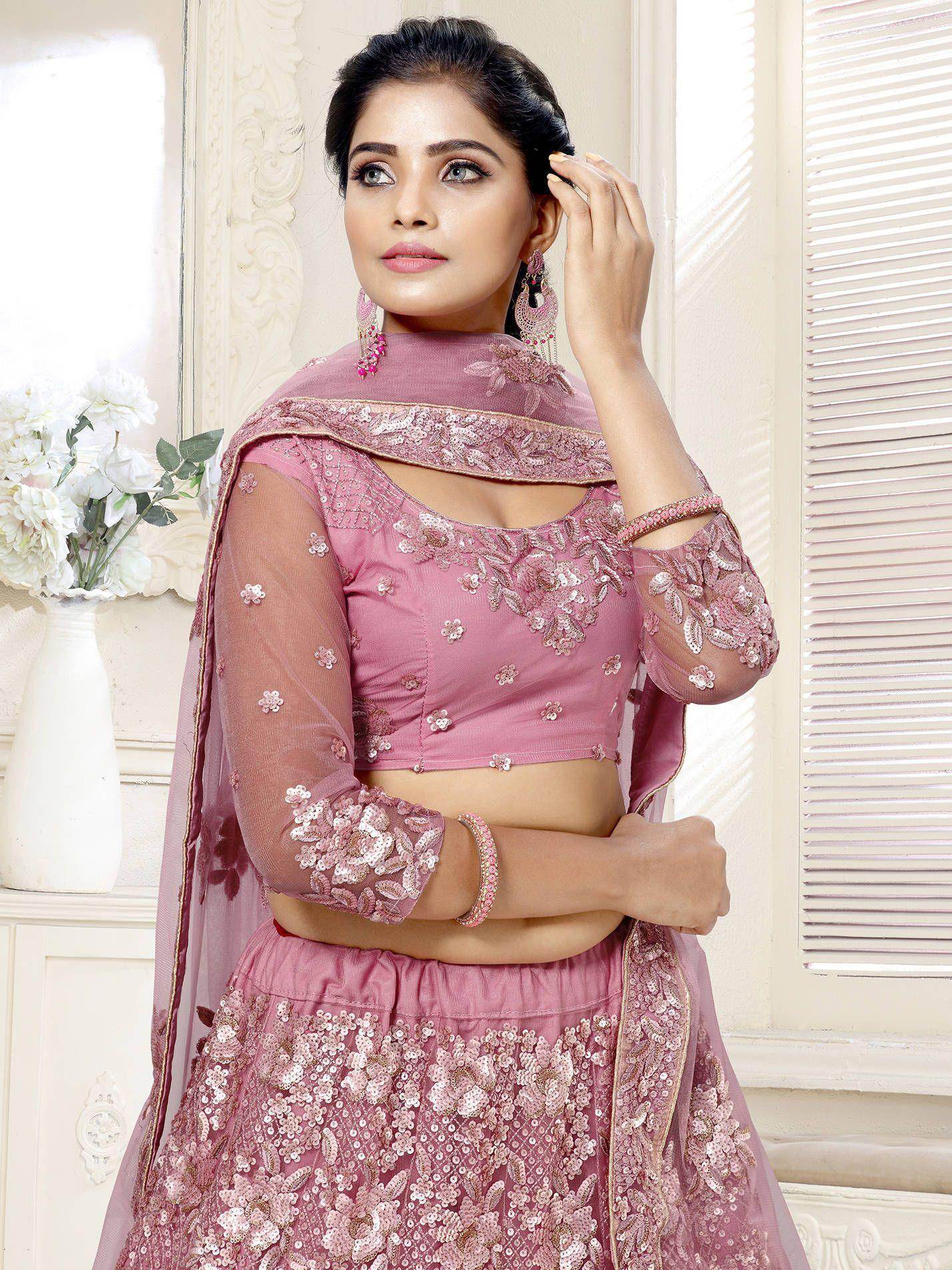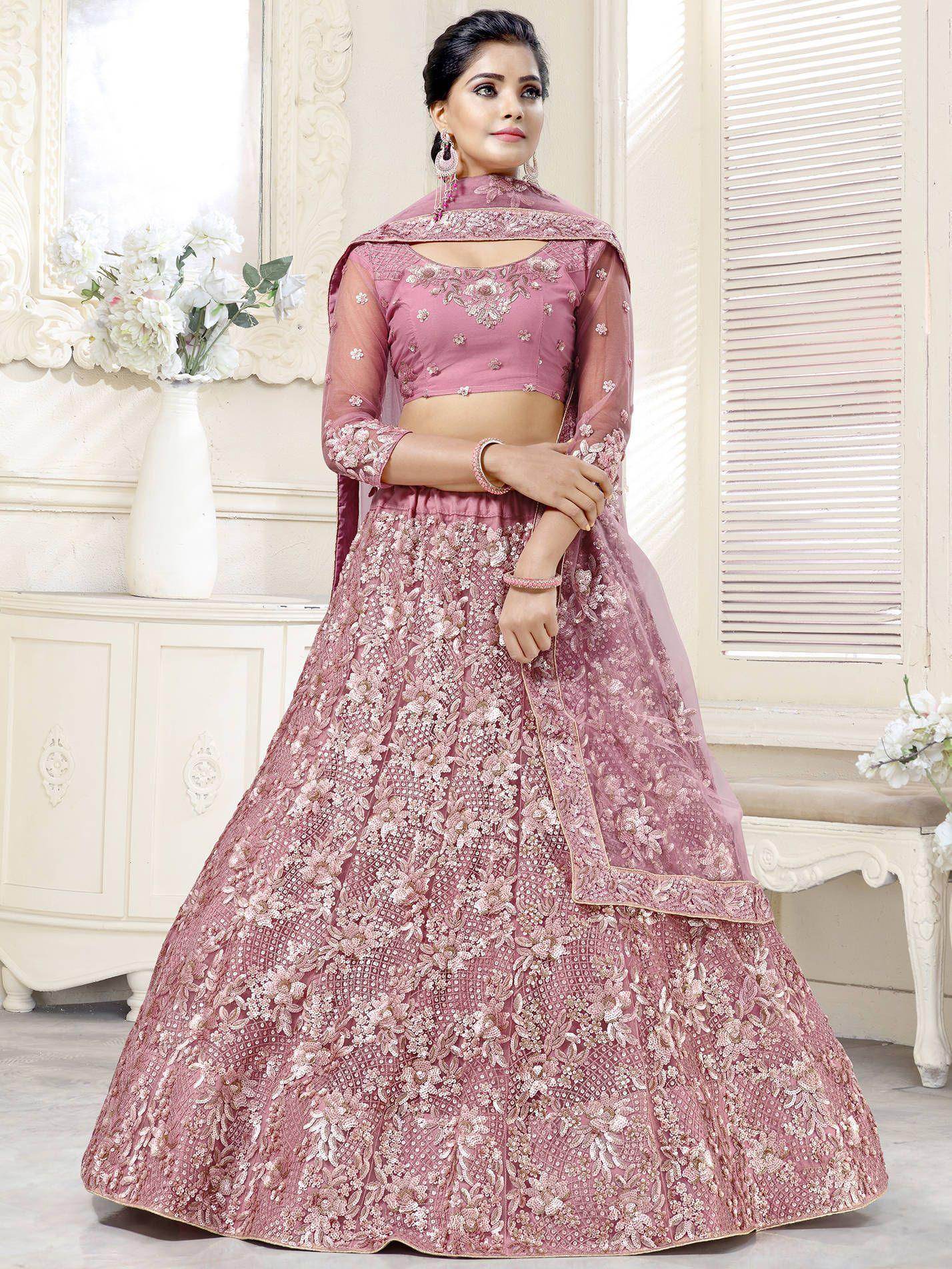 Steal everyone's heart and attention by wearing this dazzling pink lehenga choli in net material embellished with thread embroidery including mette work and double sequence work.