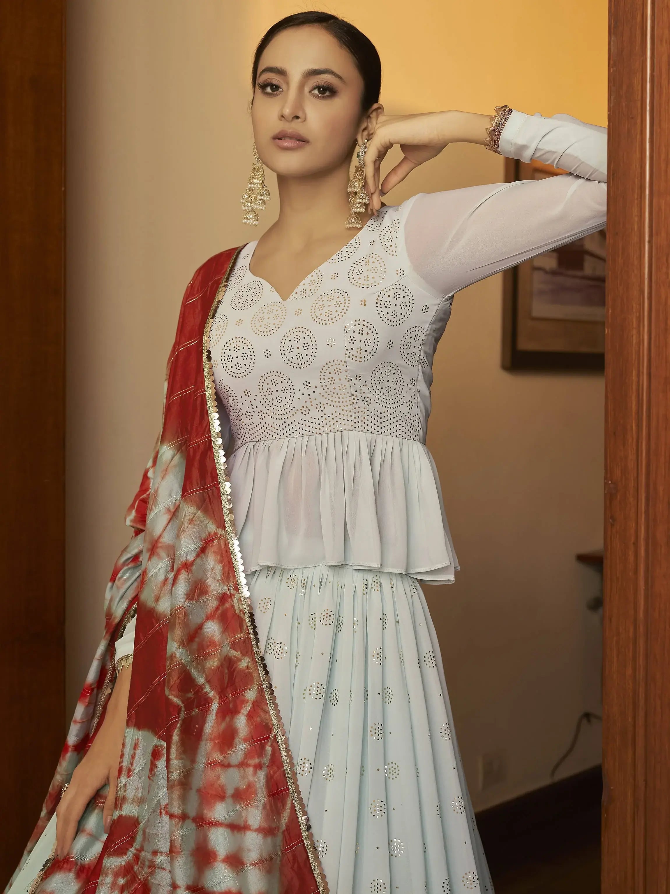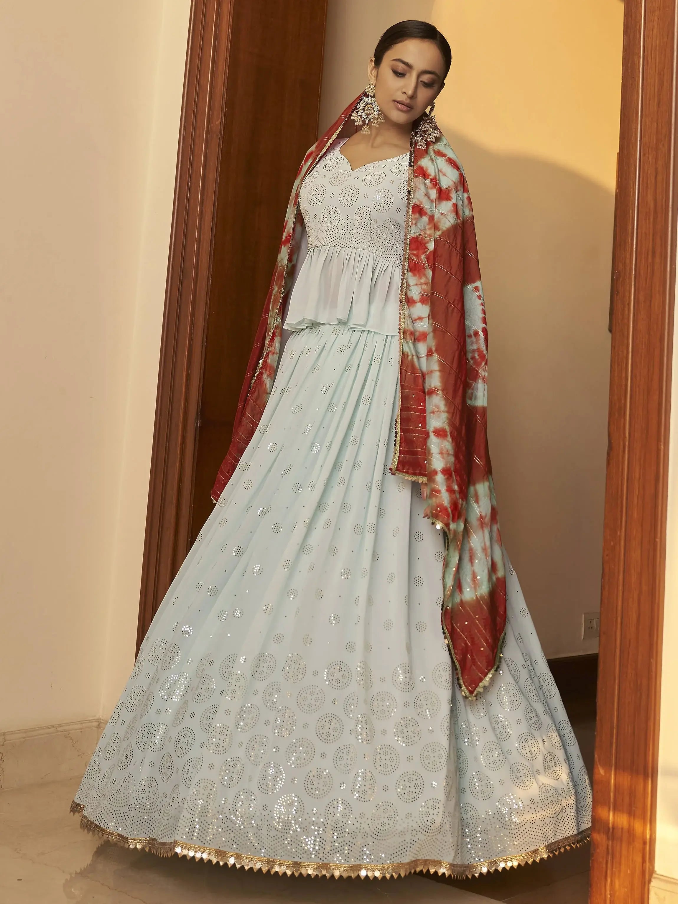 Add elegance and charm to your appearance by dressing in this gorgeous sky blue color lehenga in georgette material embellished with all-over mukaish work.