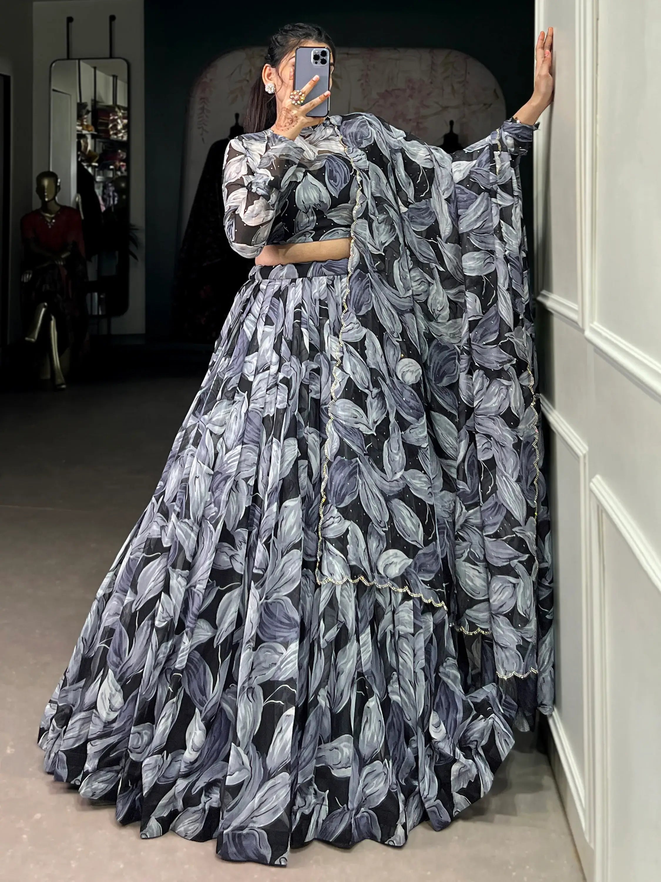 This stunning ensemble includes a black color tabby silk lehenga with intricate digital print and swarovski work, a matching choli with the same digital print and swarovski work, and a dupatta to complete the look.