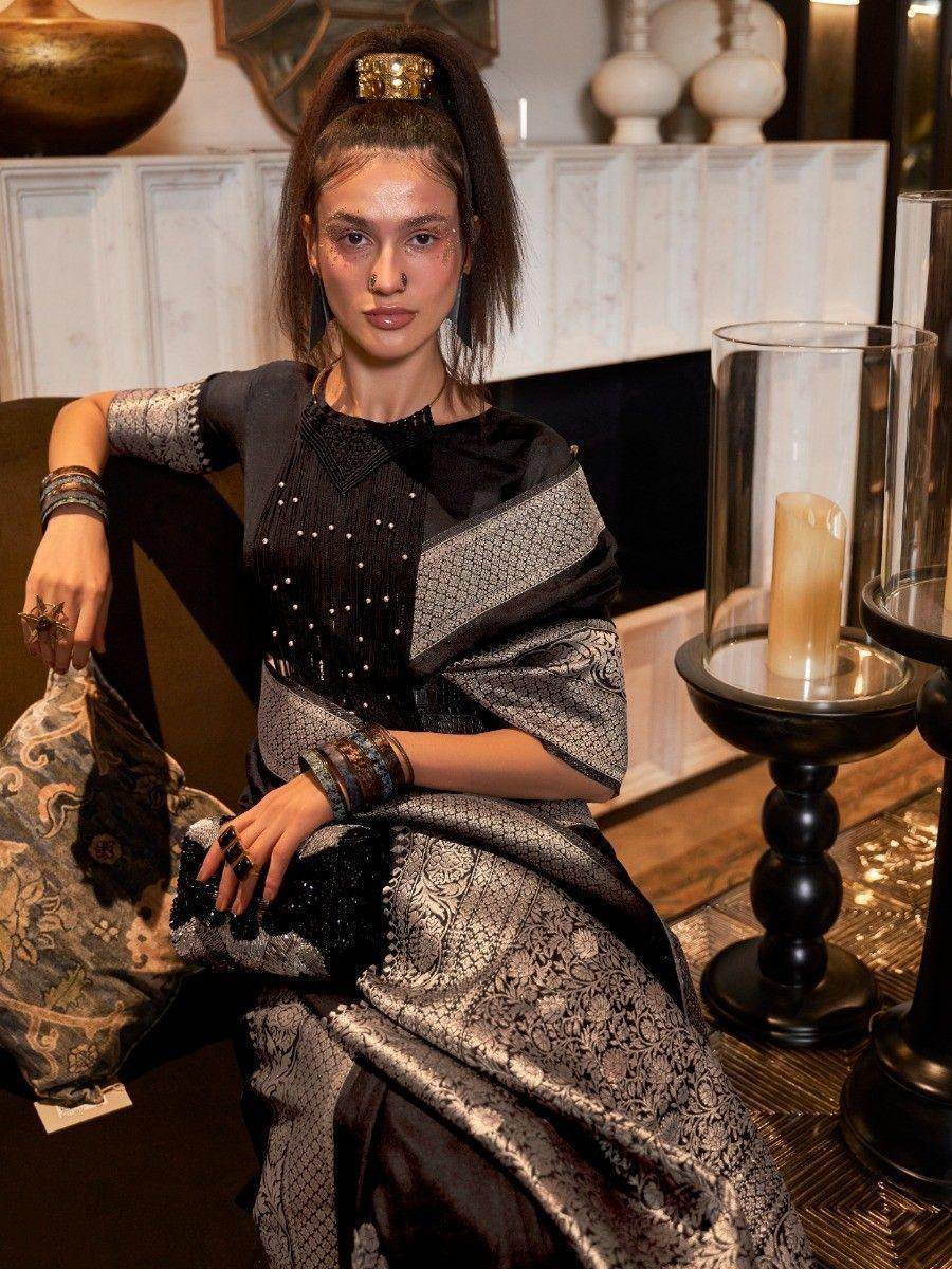 Sarees hold a special place in the hearts of women, with their timeless beauty, stunning looks, elegance, and a touch of royalty. And if you are looking for a saree that embodies all these qualities, then look no further than our precious black zari woven georgette reception wear saree with blouse.