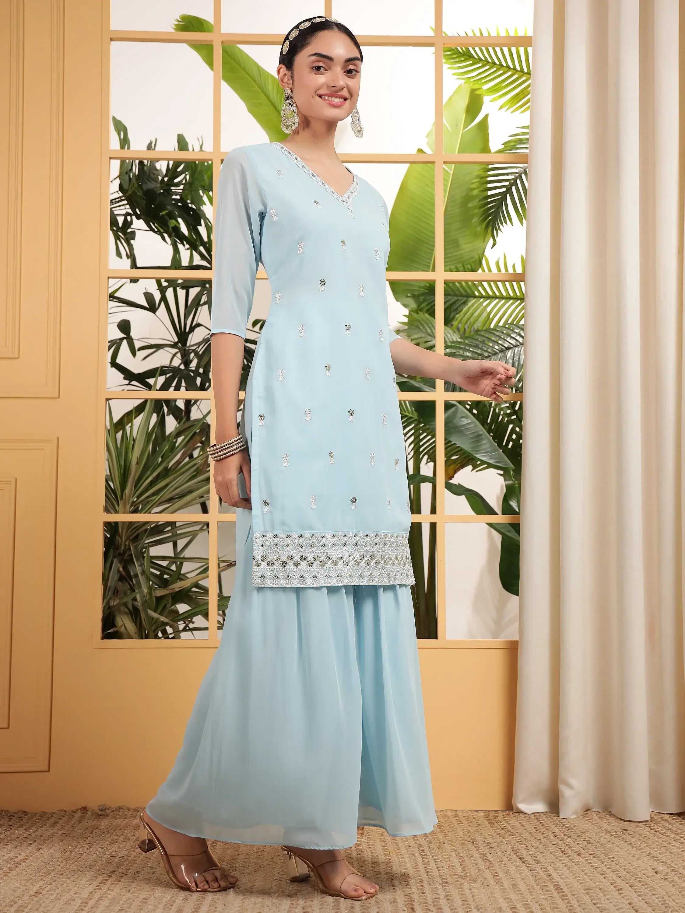 Our stunning "precious blue embroidered georgette casual wear sharara suit", is a perfect outfit for any festive occasion. This fully stitched sharara suit comes in a beautiful blue color with exquisite thread embroidery and sequin work, giving it an elegant and sophisticated look.