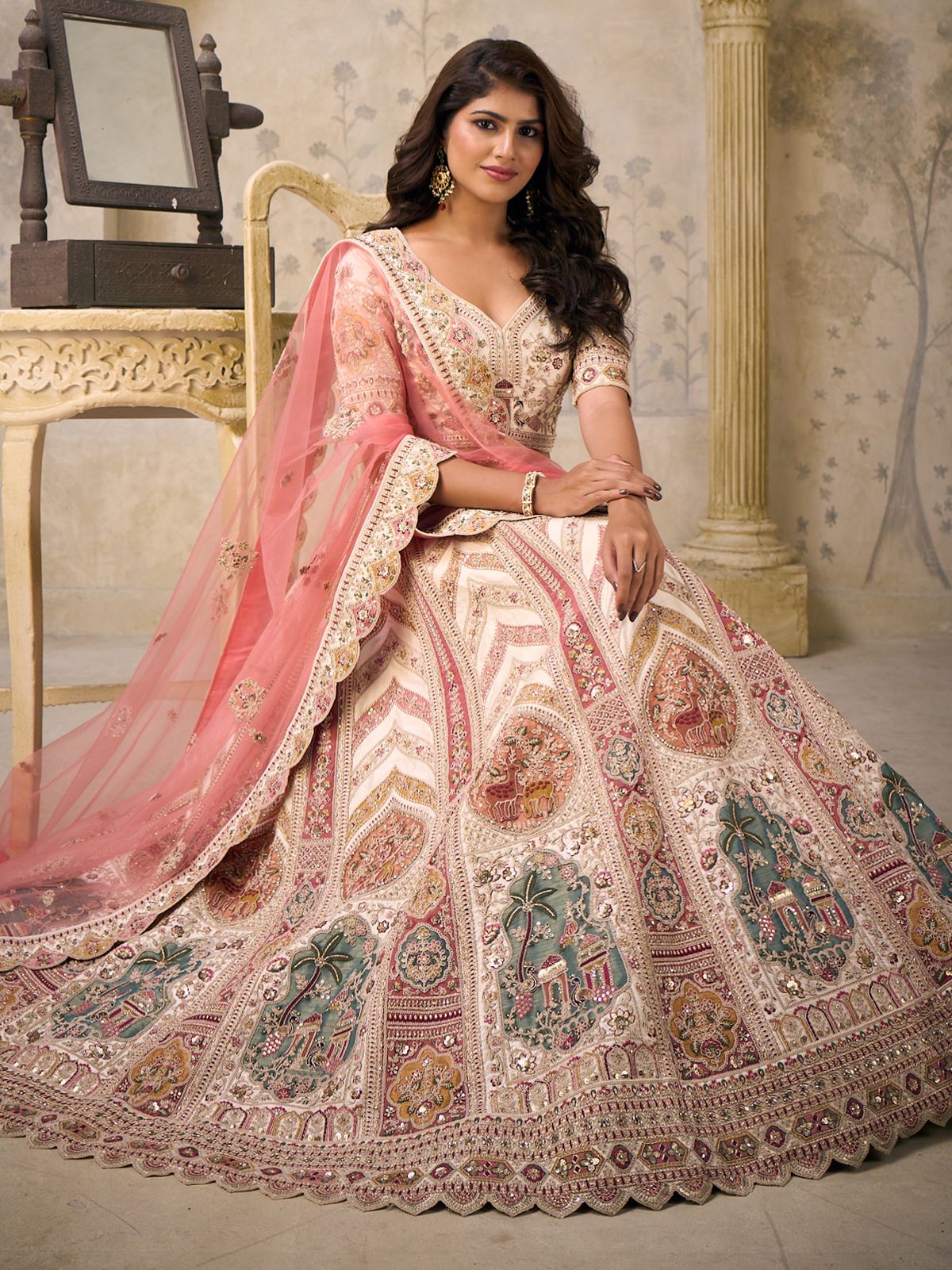 This breathtaking cream and blush pink lehenga is a masterpiece of traditional artistry and royal elegance. The skirt features intricate zari, resham, and thread embroidery depicting regal scenes, temples, and motifs inspired by Indian heritage.