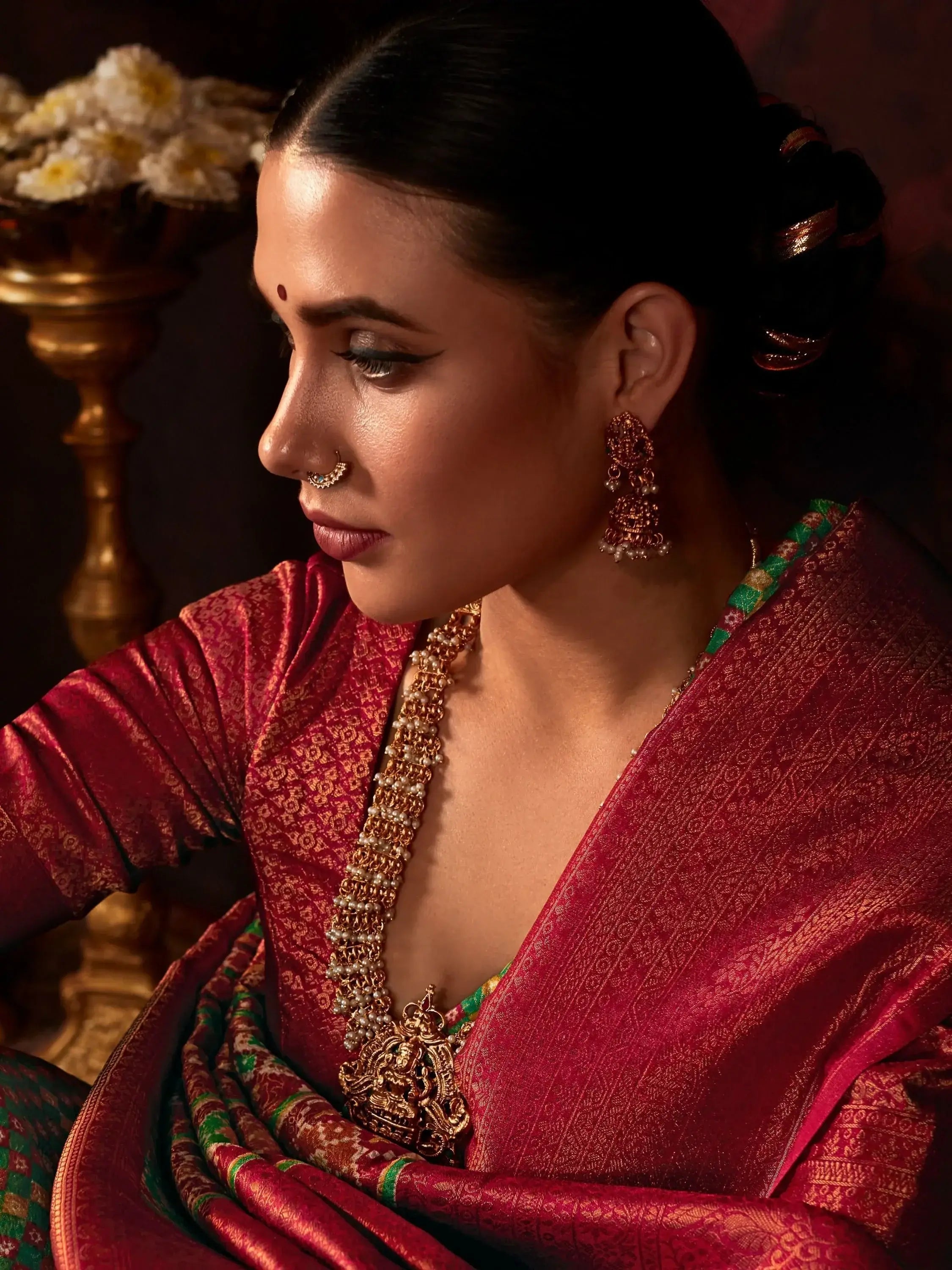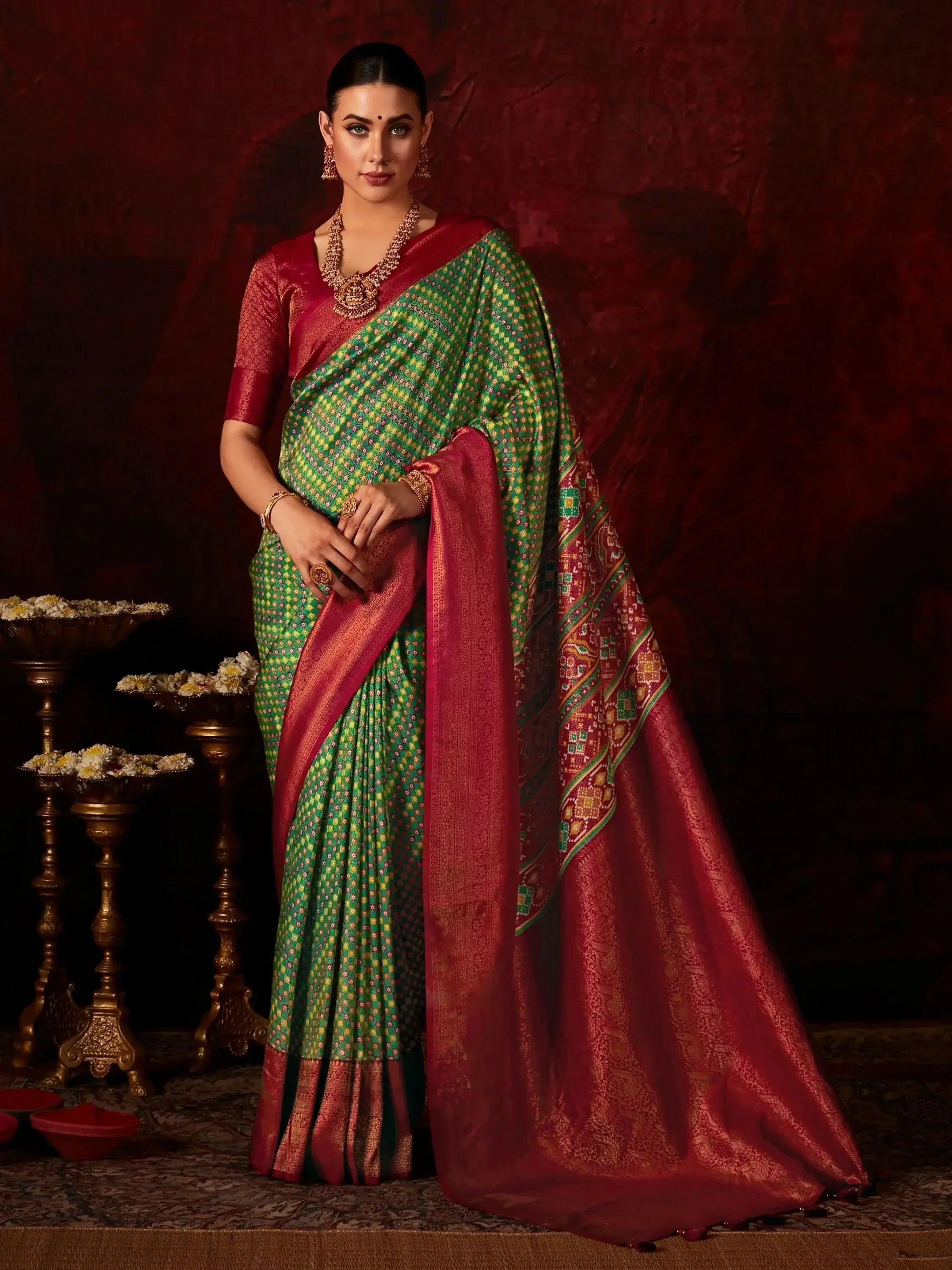 The vibrant green hue exudes freshness and vitality, while the intricate digital print and zari weaving add a touch of opulence and sophistication. With a length of 5.50 meters, this saree drapes gracefully, enveloping the wearer in a cascade of luxurious silk that sways with every step.