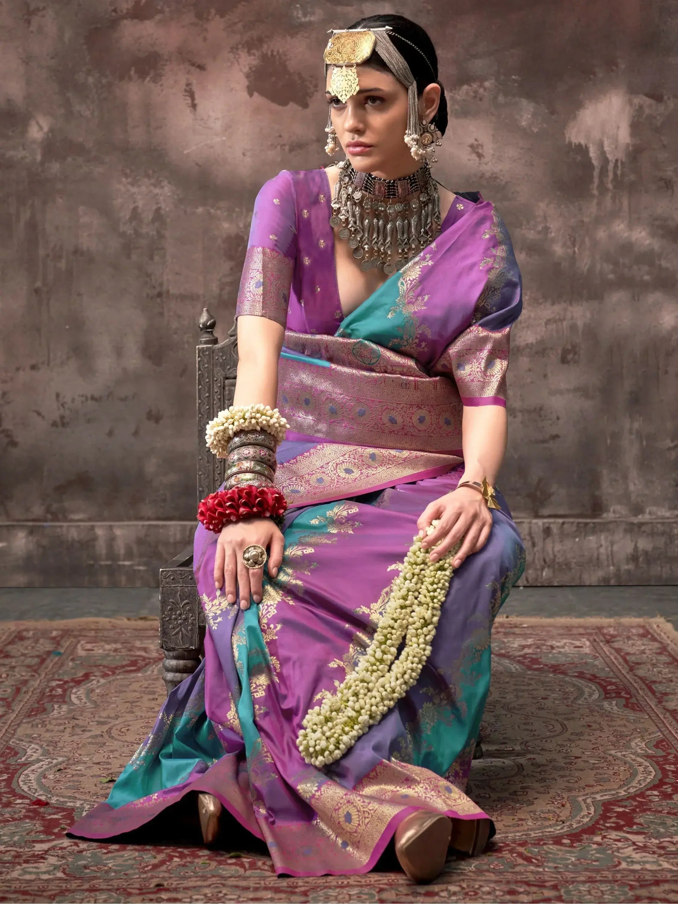 This 5.50-meter saree is complemented by a matching violet silk blouse, adorned with the same elegant zari weaving work. The blouse offers a customizable fit up to 42 inches, ensuring both comfort and style.