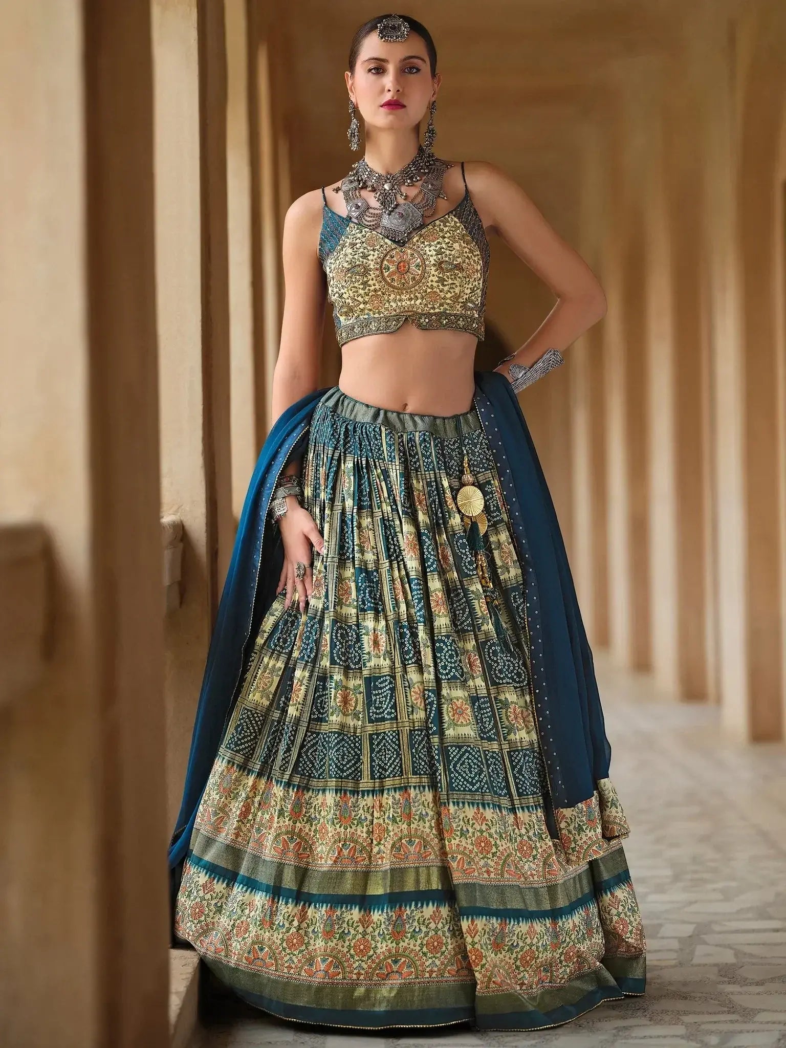 Introducing our "precious navy blue bandhani printed silk sangeet wear lehenga choli", a stunning ensemble that will make you the star of any wedding or special occasion. This fully stitched lehenga choli set includes a navy blue silk lehenga with bandhani and digital print work, foil work, and zari weaving border work.