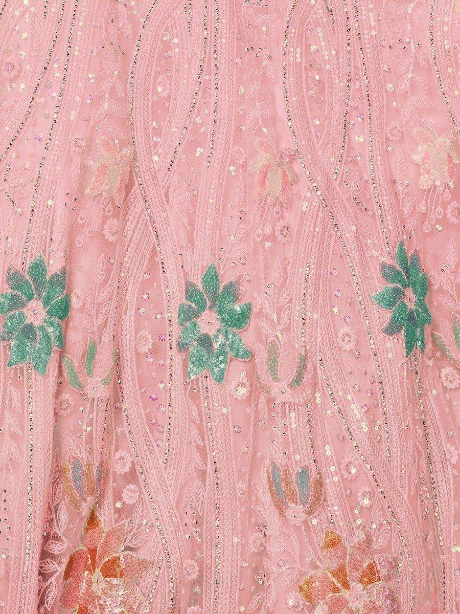 The lehenga is made from high-quality peach color net material, adorned with sequin and embroidered work. It features different patterns and styles of heavy embroidery, adding a touch of elegance and grandeur. The semi-stitched lehenga can be customized up to 42 inches, ensuring a perfect fit for every body type. The accompanying choli is made from a similar color organza material, also embellished with sequin and embroidered work. Complete your ensemble with the similar color net dupatta, which features sequin and embroidered lace work.