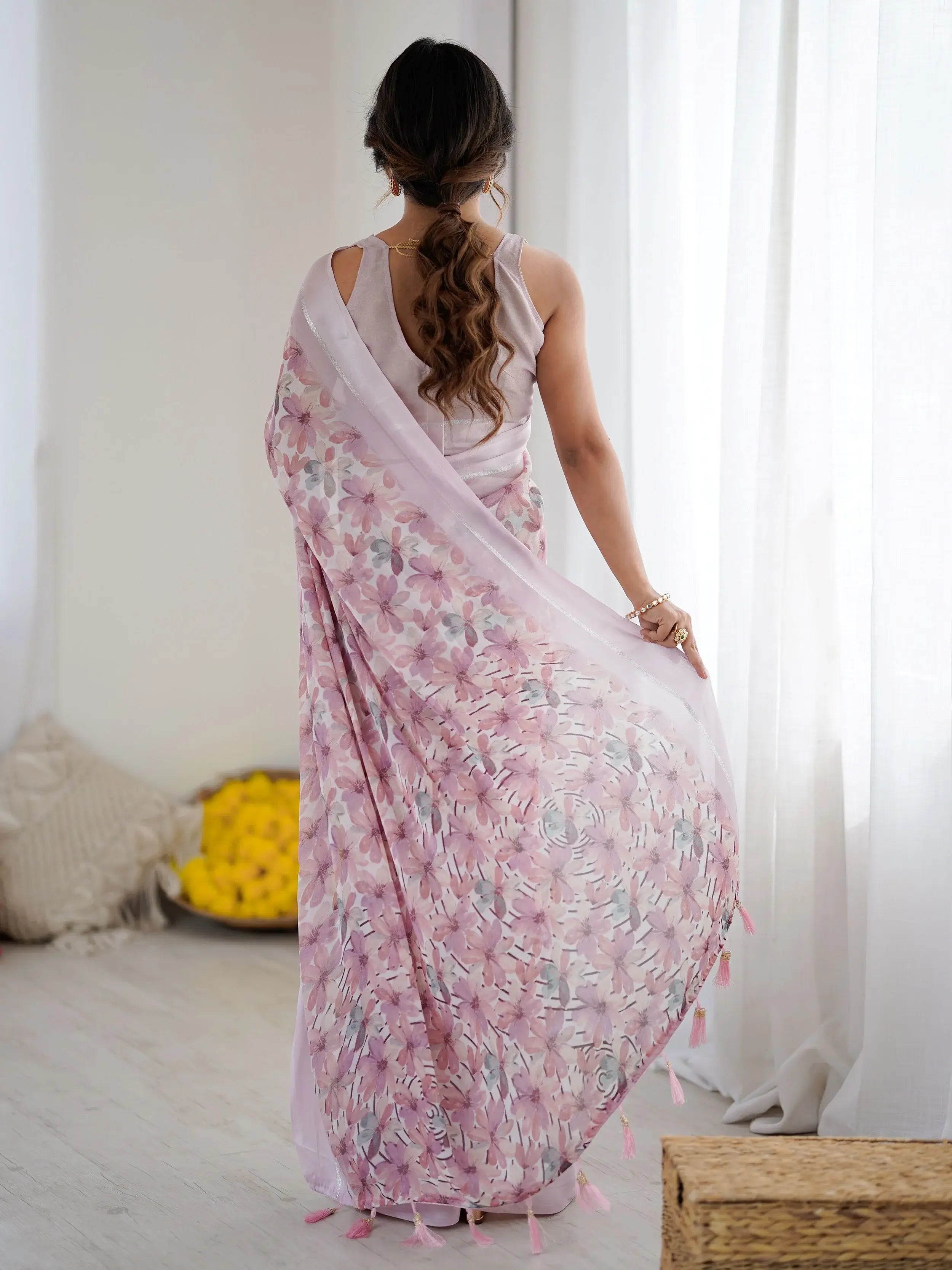 The saree features a soft pastel purple shade with elegant floral designer printing that adds charm and femininity to the overall look. Crafted from premium satin fabric, it offers a smooth drape with a lightweight and luxurious finish.