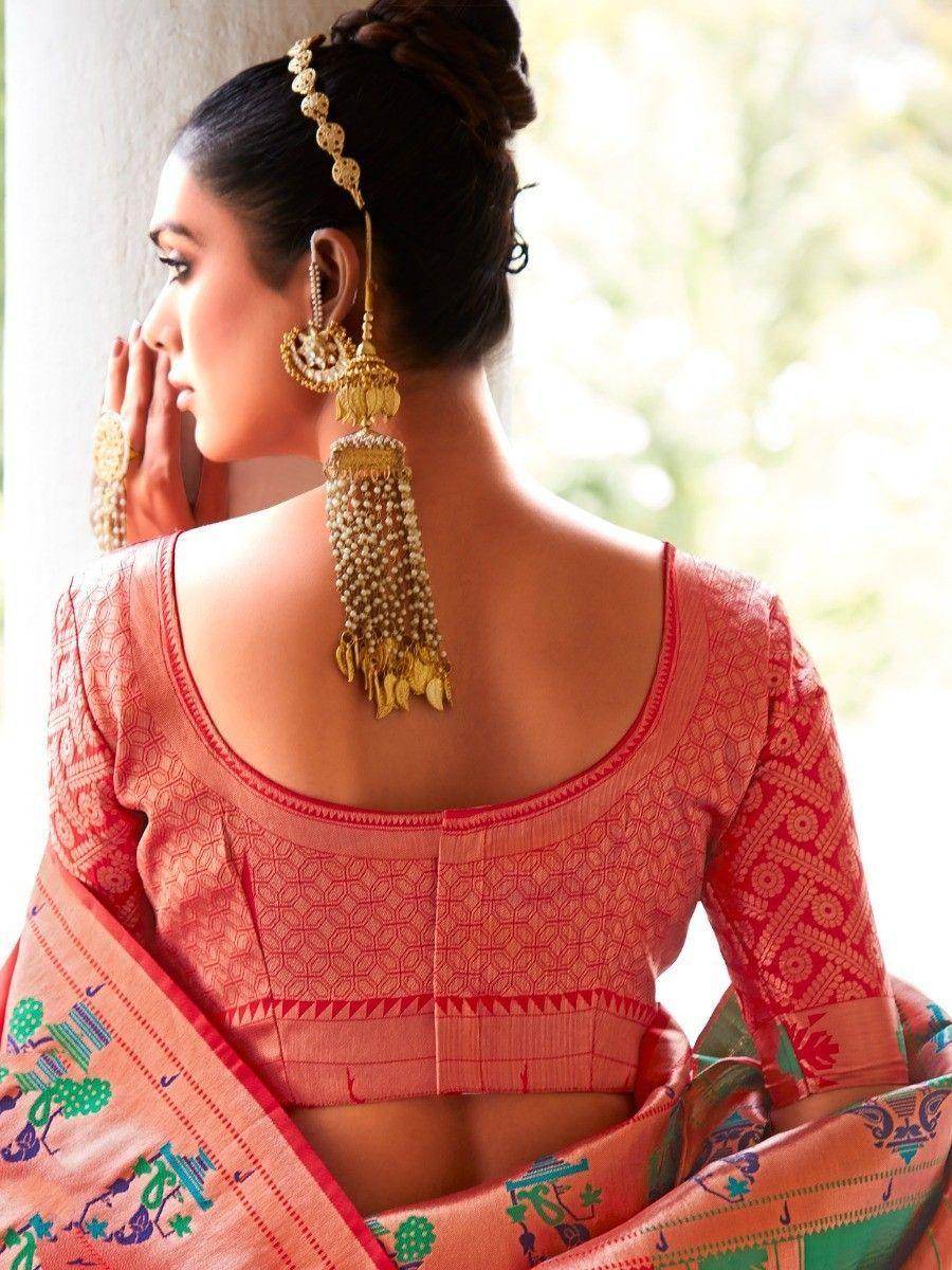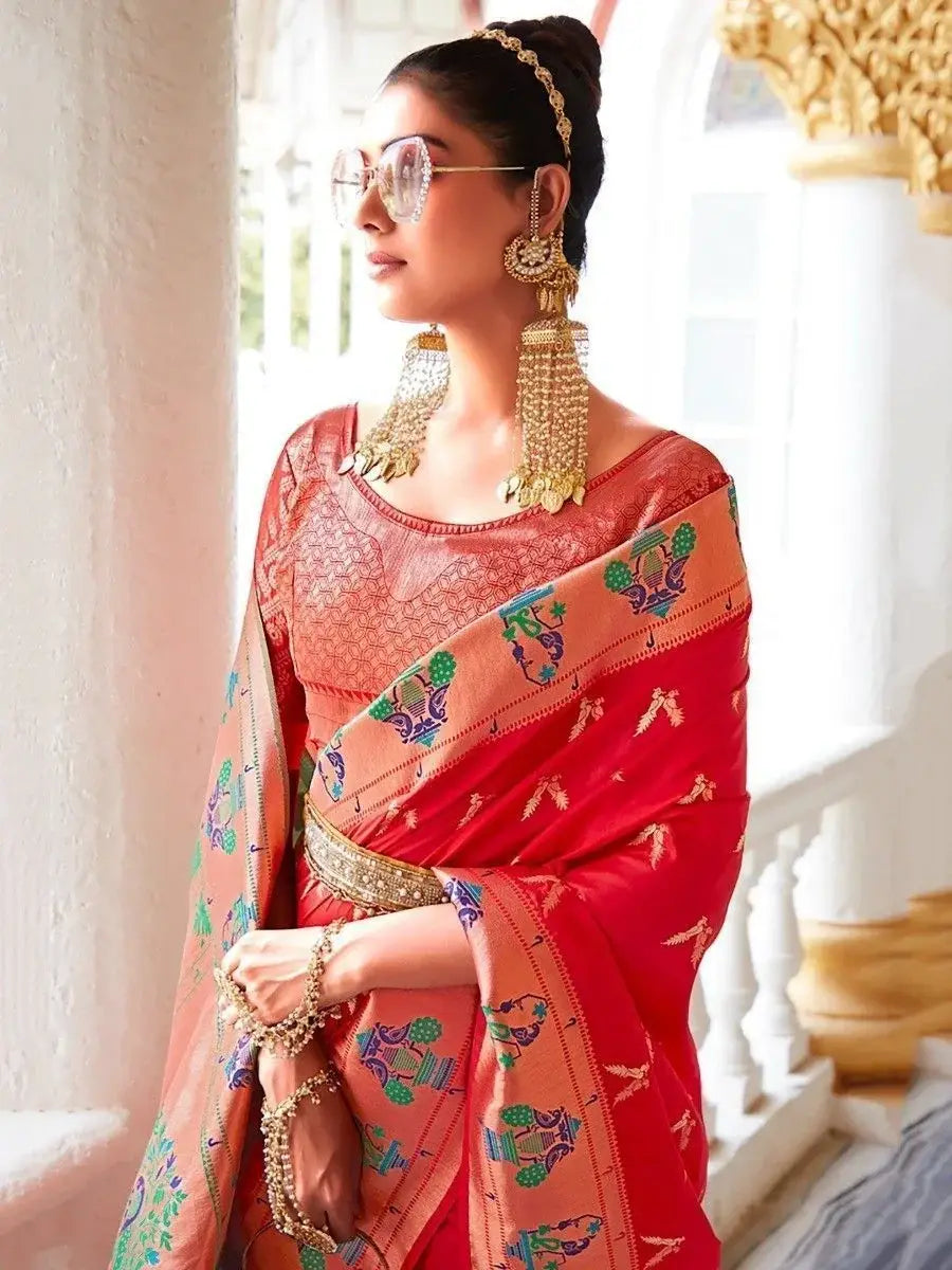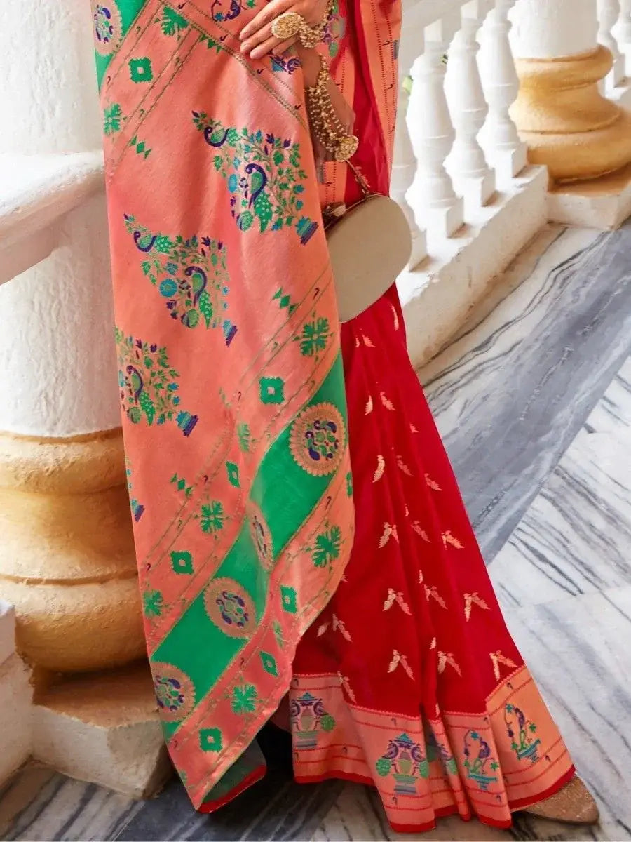 The saree comes with a matching silk blouse that also features zari weaving work, creating a seamless and coordinated ensemble. Both the saree and blouse are made from the same red color silk material, ensuring a perfect match.