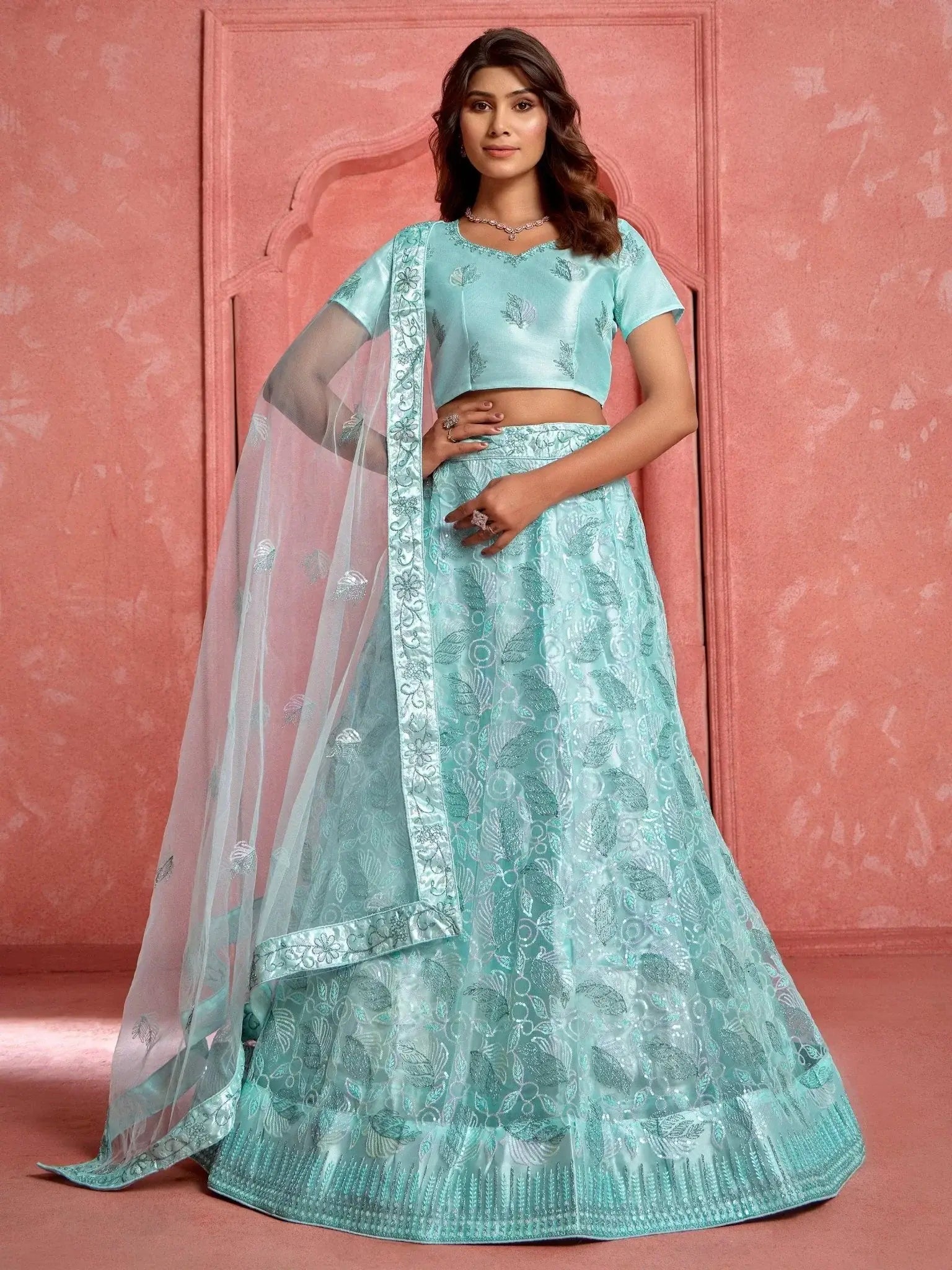 This exquisite set includes a sky-blue color net lehenga with sequin work and thread embroidered details, a matching net choli with similar embellishments, and a net dupatta featuring sequin work, thread embroidery, and a beautiful four-side border work.