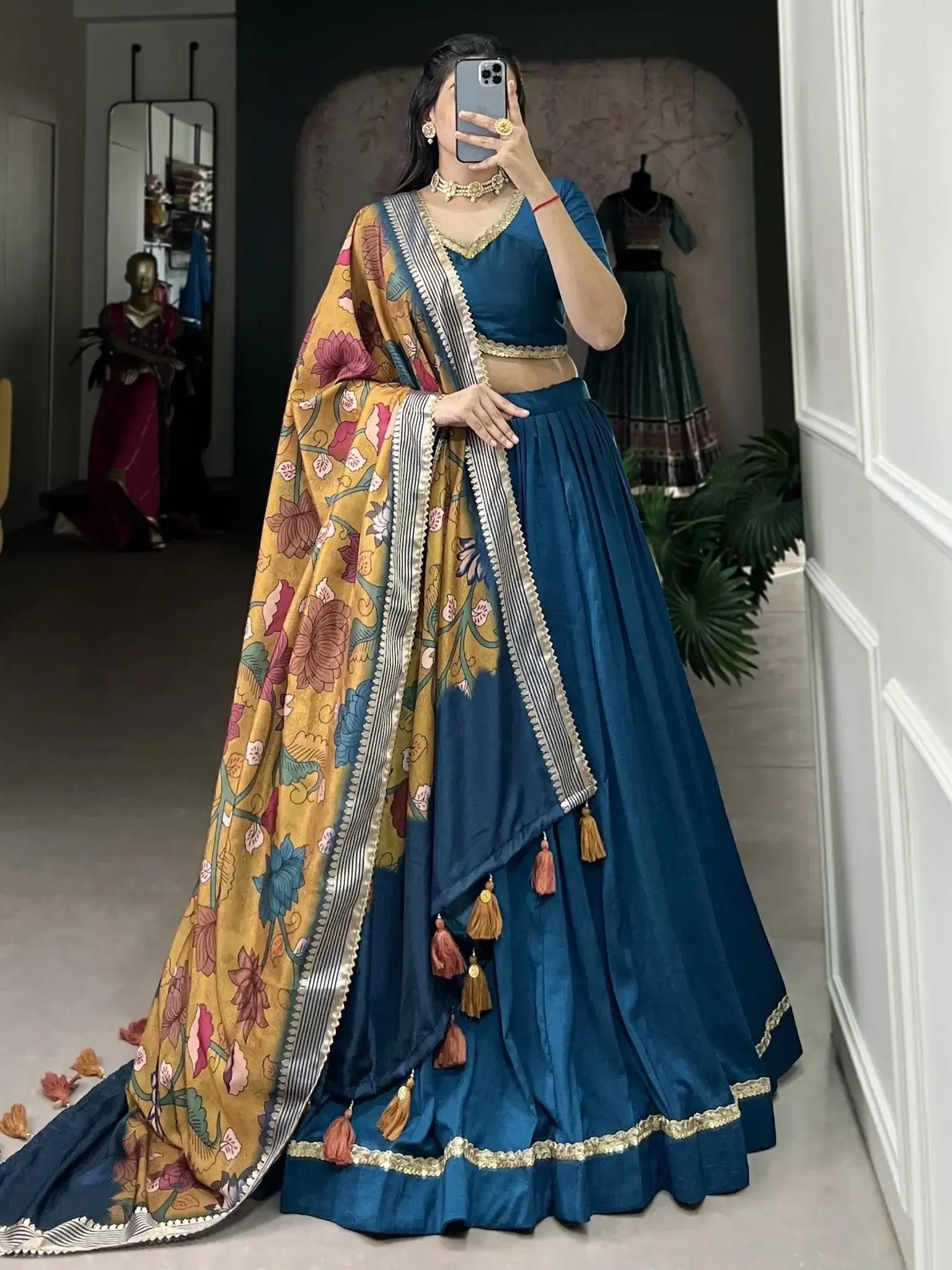 Elevate your ethnic attire with our stunning "precious teal blue lace work silk navratri wear lehenga choli." This exquisite ensemble features a teal blue chinon silk lehenga with intricate lace border work, a matching chinon silk blouse with lace detailing, and a tussar silk dupatta in the same yellow shade with print work and gota patti lace touch-up.