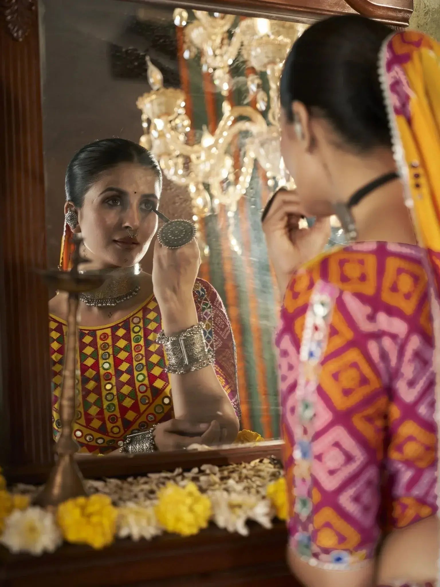 Pair this beautiful lehenga choli with matching Oxidized jewelry for a complete traditional look that is sure to turn heads. Whether you're attending a Navratri festival or a traditional event, this ensemble is guaranteed to make you stand out. Wear it with a gajra for an added touch of glamour and sophistication.