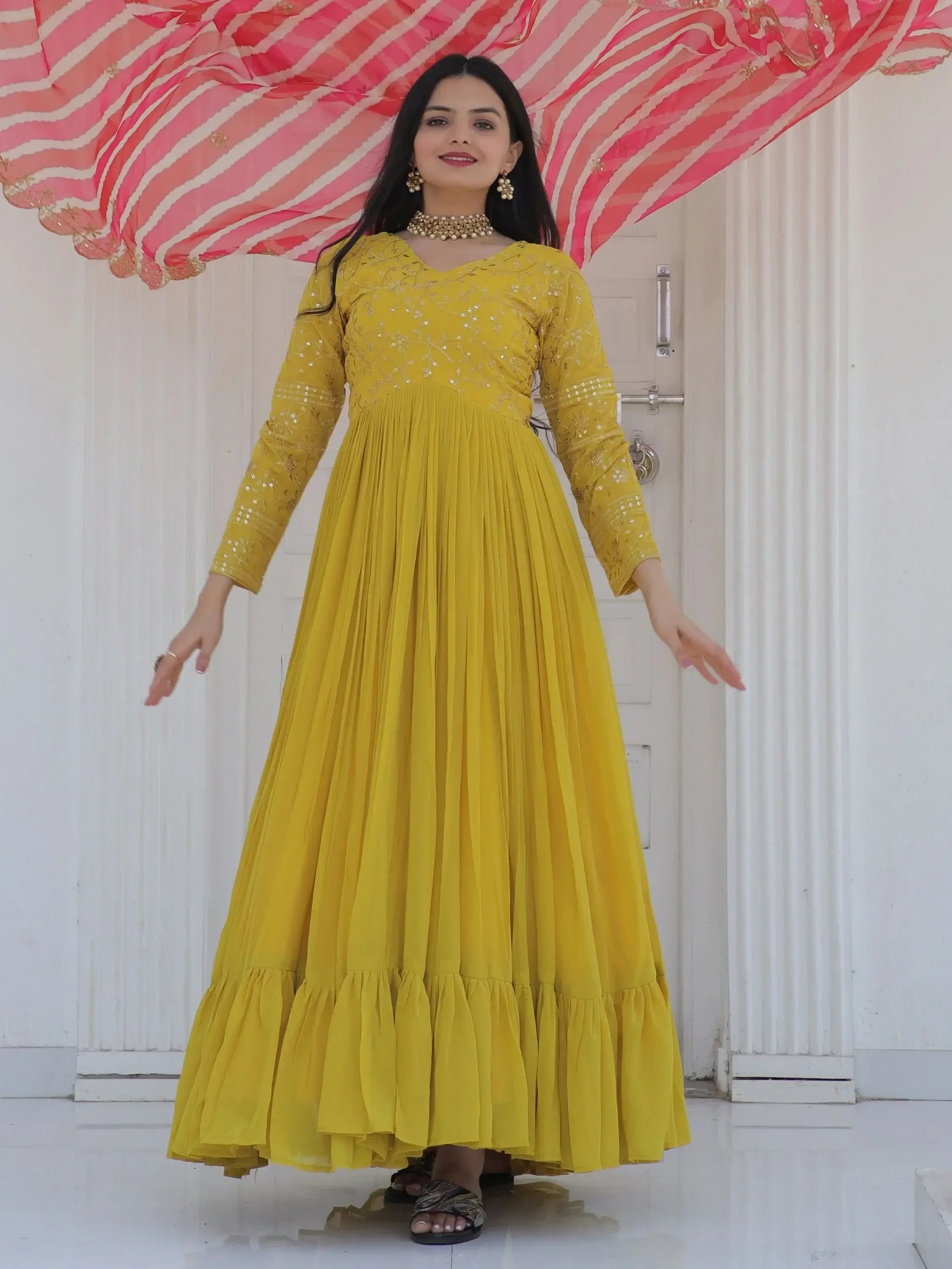 Introducing our stunning yellow reception wear gown, crafted with georgette material and adorned with multi-sequin work and zari embroidered designs. This fully stitched gown is available in sizes ranging from XS to XXL, ensuring a perfect fit for every body type. The gown features a luxurious 7-meter flair with a length of 56 inches, allowing you to make a grand entrance at any event.