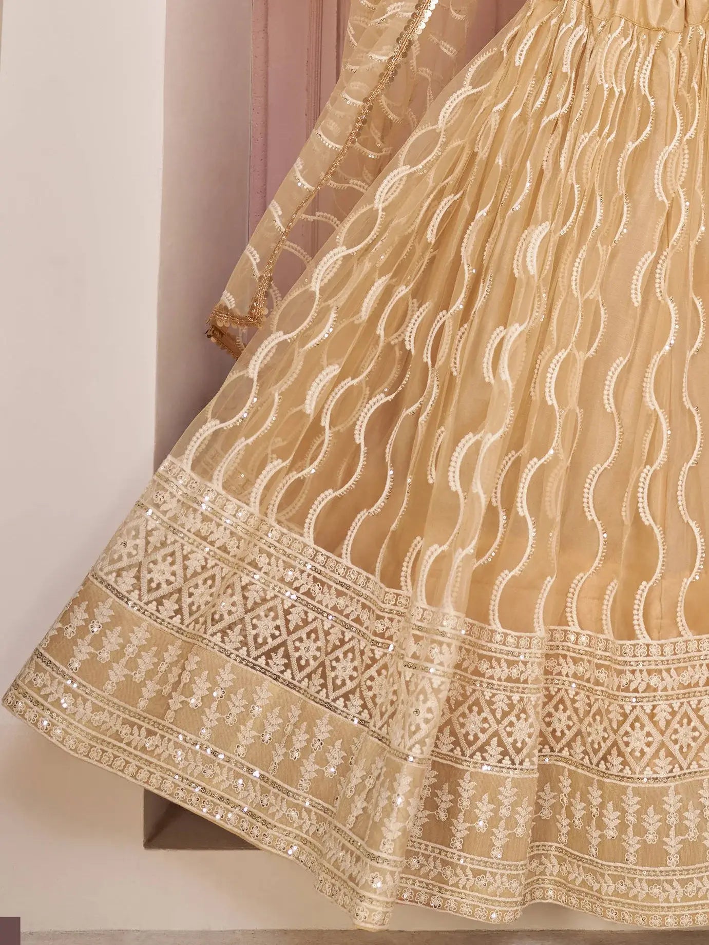 Spread the aura of freshness with this prominent beige color lehenga made of mono net material embellished with white thread embroidery and sequins work.