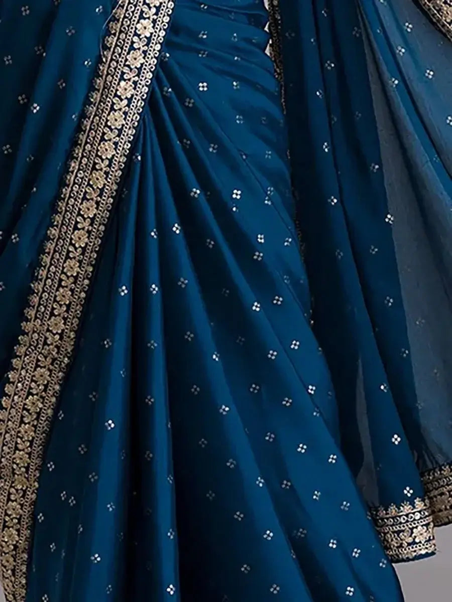 Look like a diva with our pretty blue heavy border chinon event wear a saree with a blouse. This exquisite navy blue saree is crafted with chinon material, adorned with stunning foil work and a heavy lace border. The captivating navy blue color adds elegance and sophistication to your overall appearance.