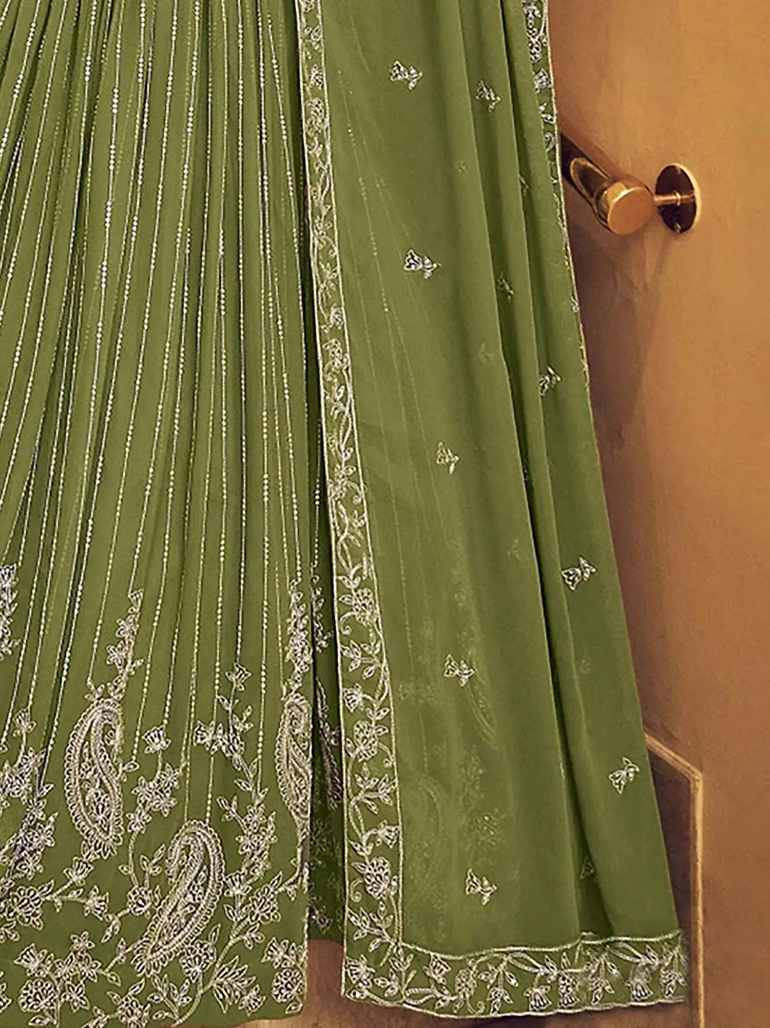 Paired with a coordinated dupatta featuring subtle embroidered motifs and a fine border, this grey georgette lehenga set is ideal for festive functions, weddings, and elegant celebrations. A perfect blend of simplicity and sophistication.