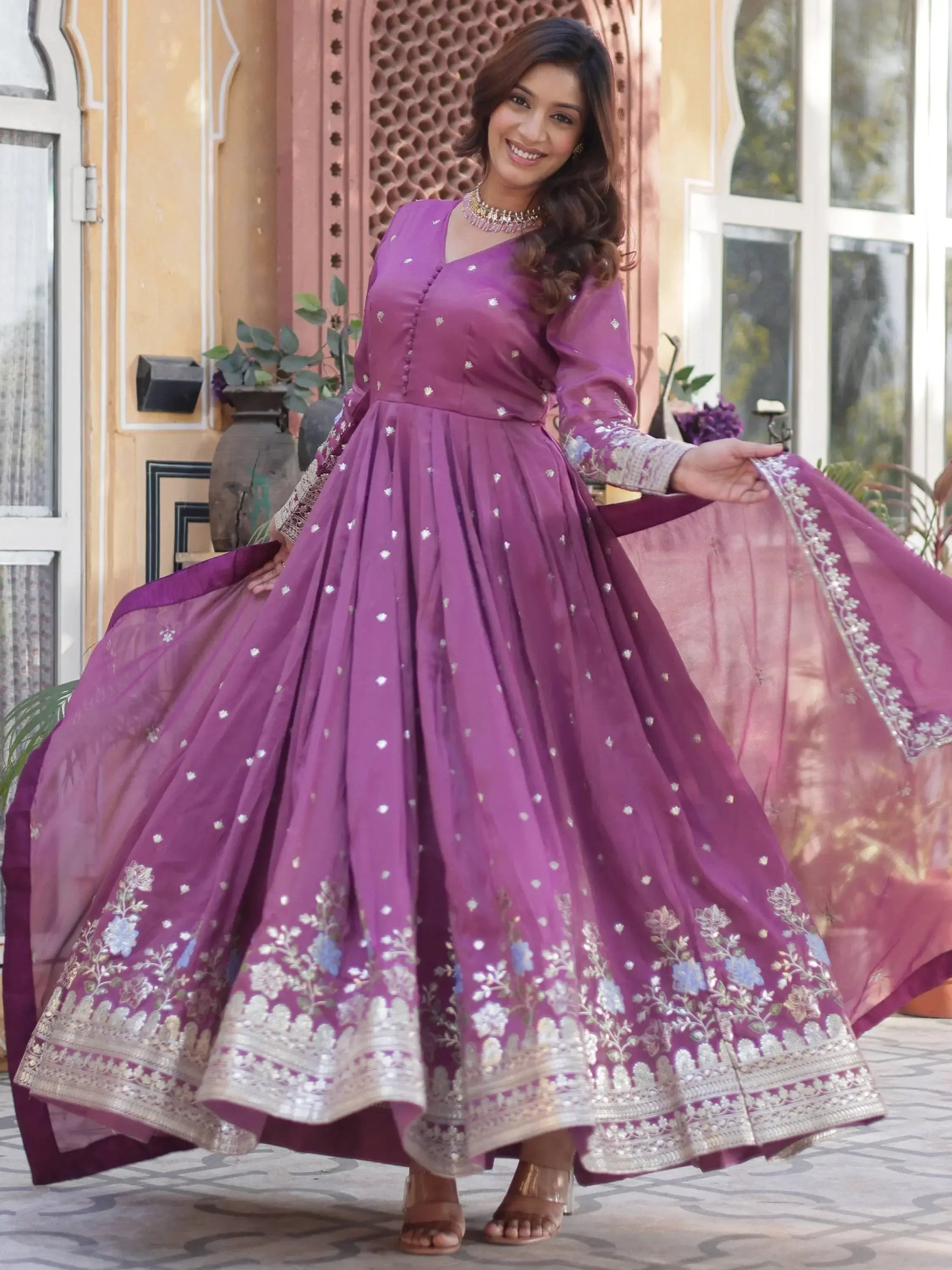 Make an elegant entrance in our pretty mauve viscose silk gown, designed especially for festive and function wear. This stunning gown is embellished with intricate sequins, zari, and foil embroidery work that adds a soft shimmer and regal charm. The delicate mauve tone paired with fine detailing brings out a graceful and modern traditional look.