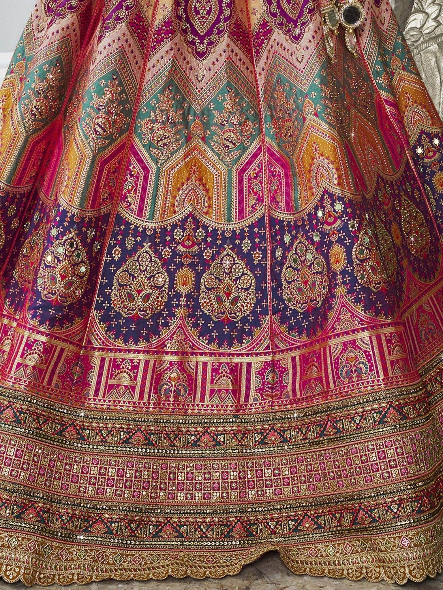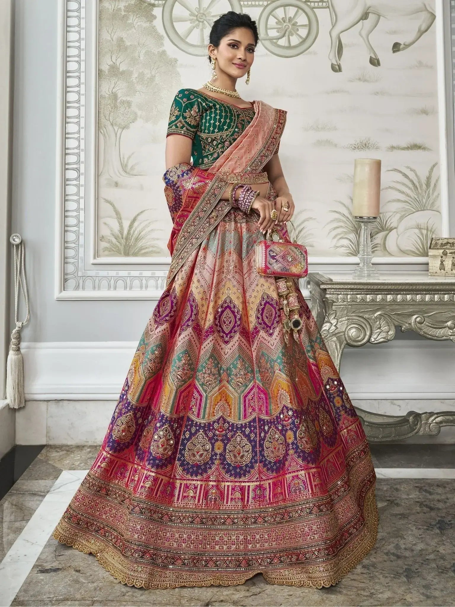 Radiate warmth and elegance with this stunning multi-color embroidered silk wedding lehenga choli, complemented by a beautifully designed dupatta. Crafted from luxurious banarasi silk, this piece is an exquisite blend of tradition and sophistication, perfect for making a lasting impression.