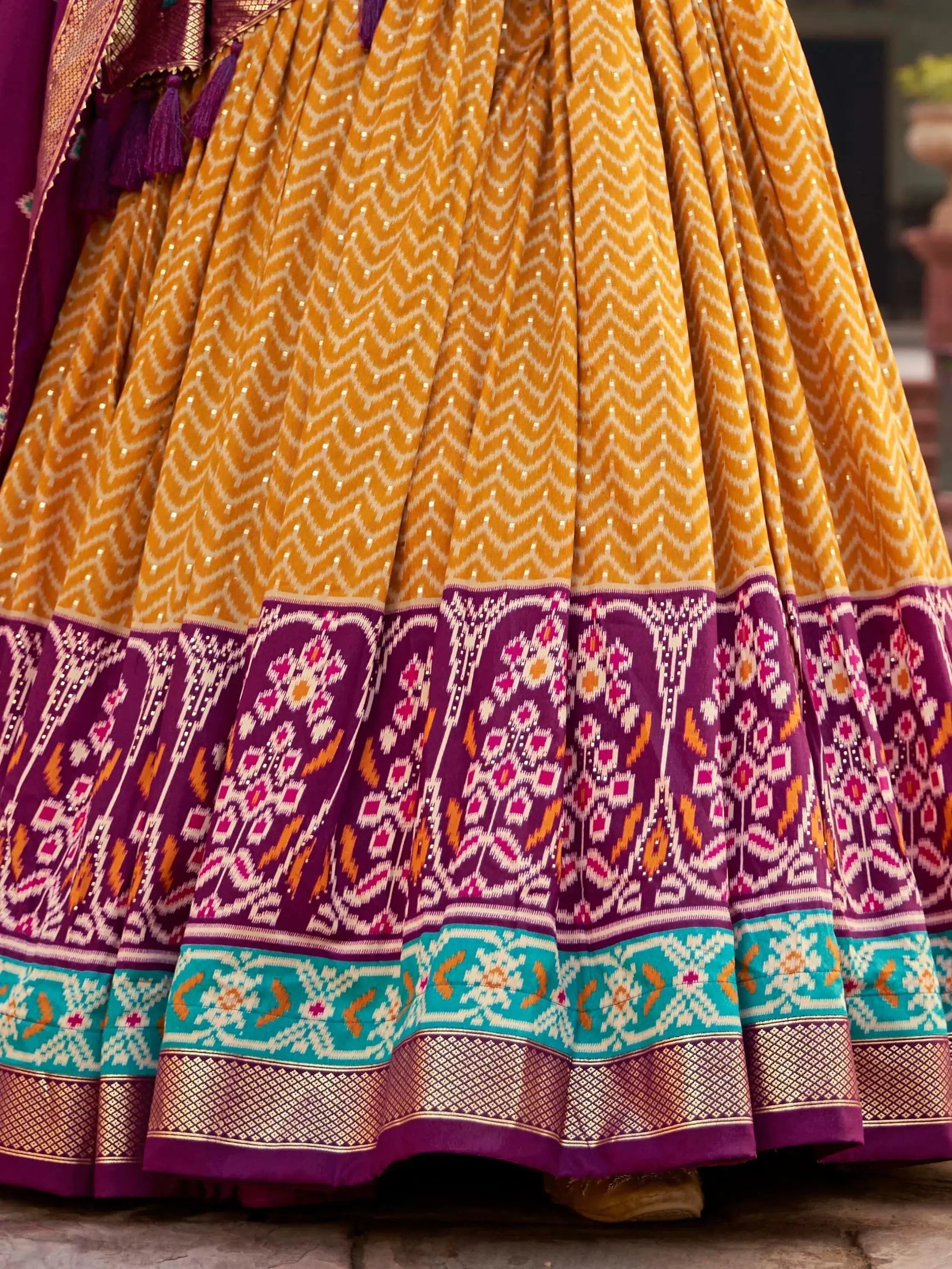 Introducing a stunning ensemble that exudes vibrancy and elegance - the mustard yellow color tussar silk lehenga adorned with exquisite foil work and patola print. Accompanied by a purple color tussar silk choli featuring patola print work and foil detailing, along with a matching tussar silk dupatta with intricate patola print work and tassel attachments, this ensemble is a celebration of traditional craftsmanship and modern style.