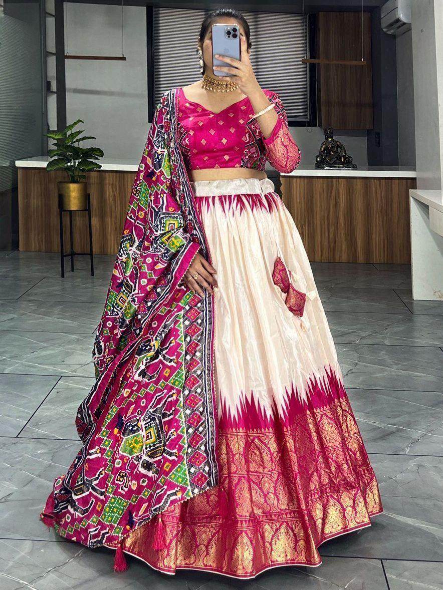 The delicate craftsmanship and attention to detail make it a standout piece in any wardrobe. Whether you're attending a Navratri event or a wedding, this ensemble will make you the center of attention. Don't miss the opportunity to own this off-white & pink patola printed silk navratri wear lehenga choli from Ethnic Plus and stand out from the crowd.