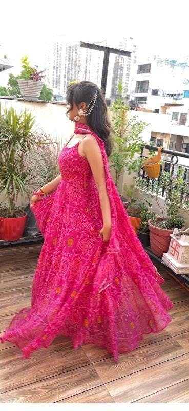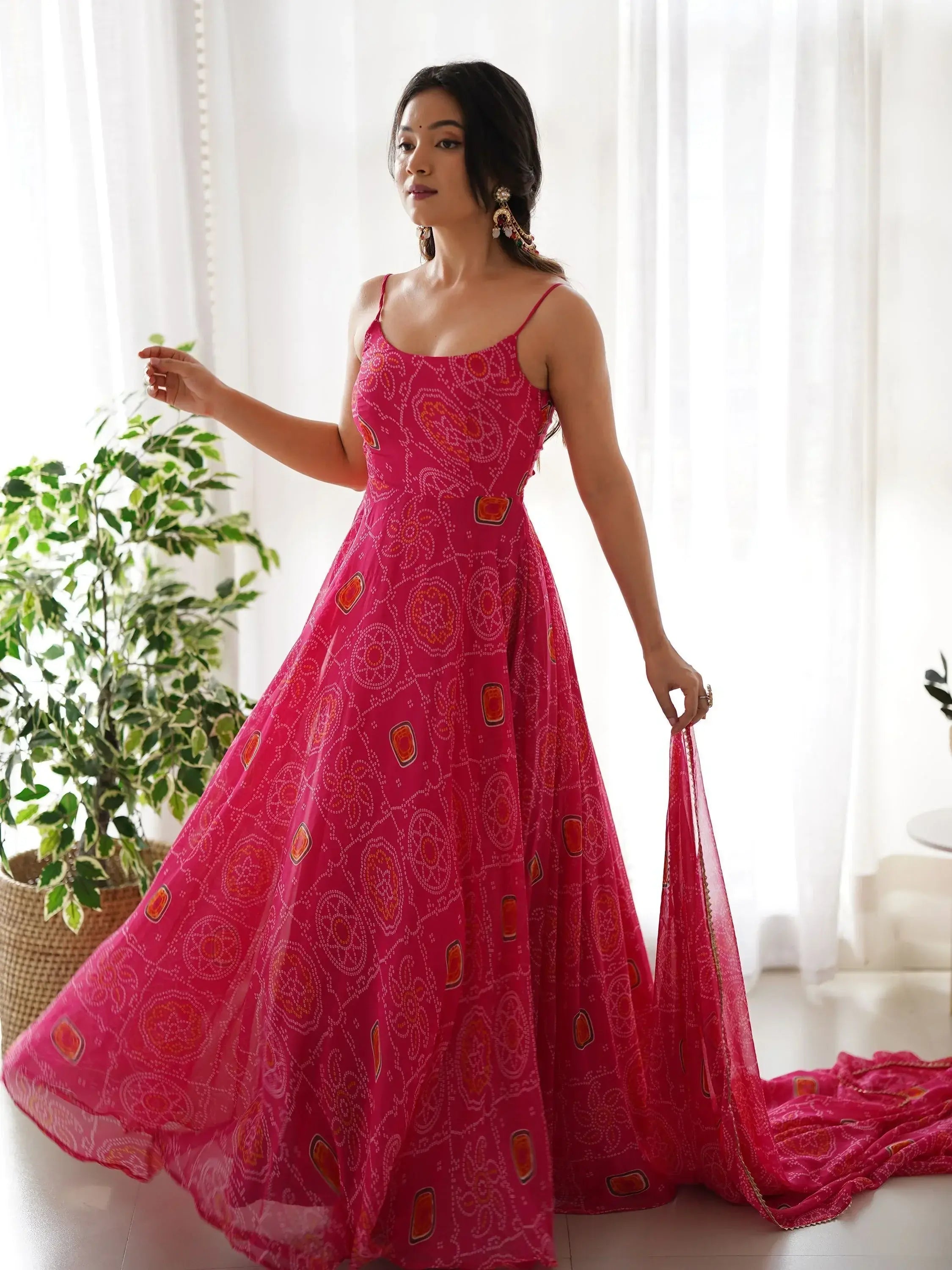 Our "pretty pink bandhani printed chiffon festival wear gown with dupatta" is the perfect addition to your ethnic wear collection. With its beautiful design, comfortable fit, and versatile styling options, this gown is sure to become a favorite for all your special occasions. Shop now and elevate your festive look with this stunning pink gown!